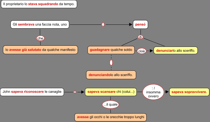 Questa Cmap, creata con IHMC CmapTools, contiene informazioni relative a: John 06, sapeva scansare chi (colui...) : / insomma ovvero sapeva sopravvivere., Gli sembrava una faccia nota, uno che lo avesse già salutato da qualche manifesto, guadagnare qualche soldo denunciandolo allo sceriffo., sapeva scansare chi (colui...) ...il quale avesse gli occhi o le orecchie troppo lunghi, John sapeva riconoscere le canaglie , sapeva scansare chi (colui...), pensò di denunciarlo allo sceriffo., Gli sembrava una faccia nota, uno ; pensò, pensò di guadagnare qualche soldo, guadagnare qualche soldo cioè denunciarlo allo sceriffo.