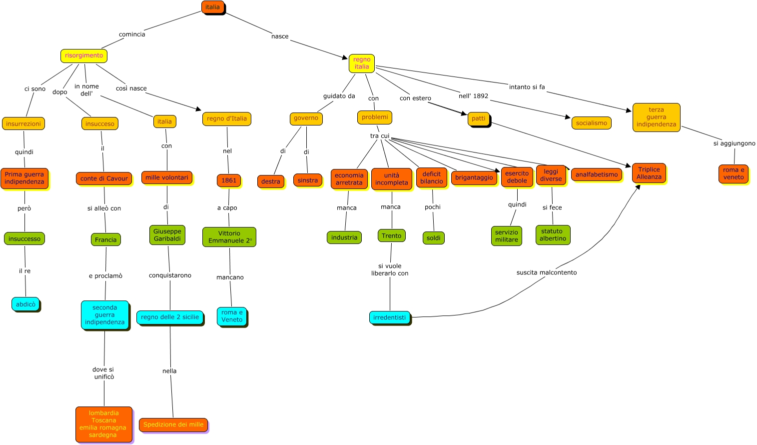 Questa Cmap, creata con IHMC CmapTools, contiene informazioni relative a: italia, problemi tra cui leggi diverse, risorgimento così nasce regno d'Italia, esercito debole quindi servizio militare, problemi tra cui economia arretrata, regno italia nell' 1892 socialismo, conte di Cavour si alleò con Francia, risorgimento ci sono insurrezioni, problemi tra cui analfabetismo, regno italia con estero Triplice Alleanza, risorgimento in nome dell' italia, regno italia con problemi, Prima guerra indipendenza però insuccesso, risorgimento dopo insucceso, insucceso il conte di Cavour, Francia e proclamò seconda guerra indipendenza, problemi tra cui brigantaggio, leggi diverse si fece statuto albertino, italia nasce regno italia, problemi tra cui deficit bilancio, insuccesso il re abdicò