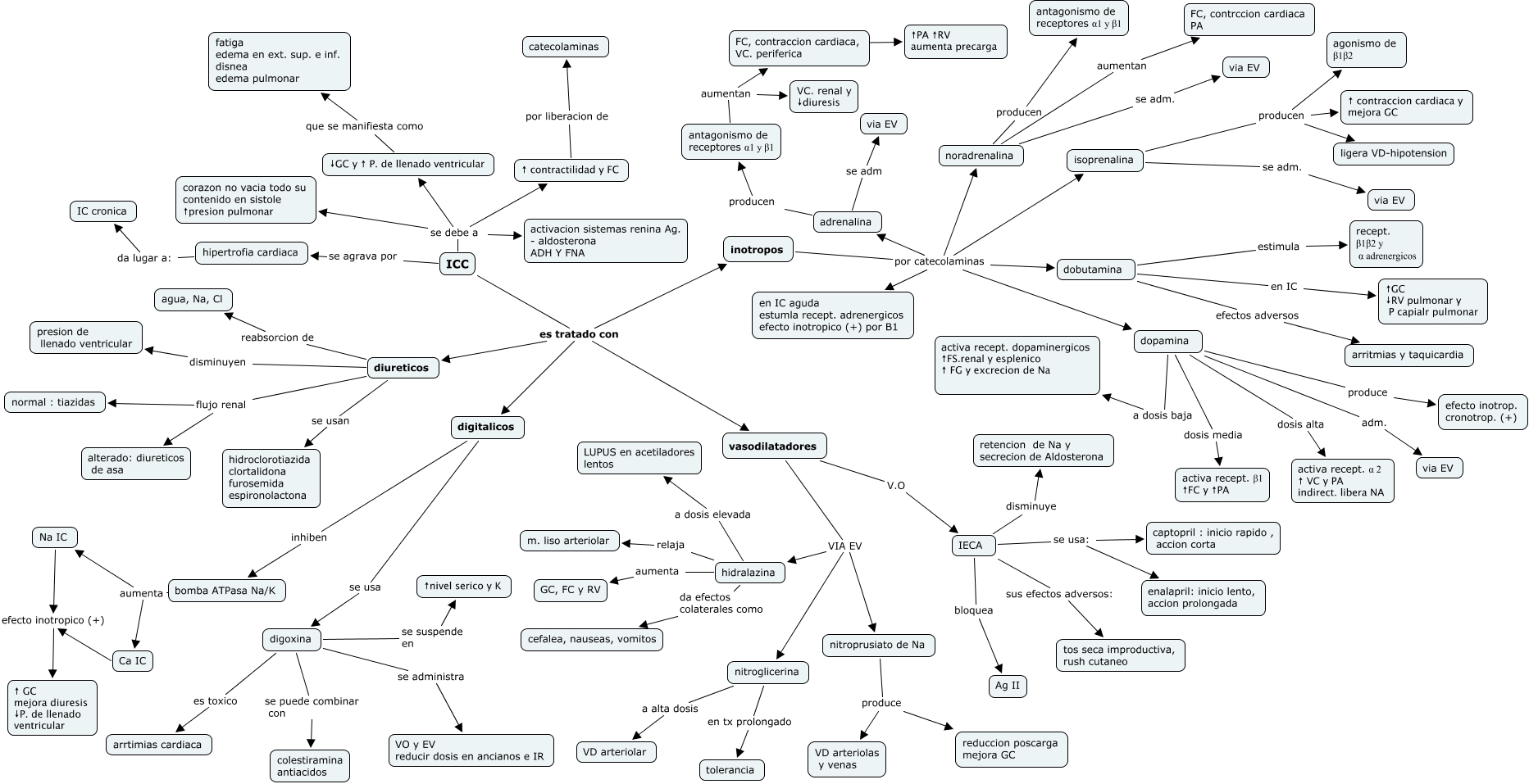 Este Cmap, tiene información relacionada con: ICC, ICC es tratado con vasodilatadores, hidralazina relaja m. liso arteriolar, inotropos por catecolaminas dopamina, nitroglicerina a alta dosis VD arteriolar, dopamina dosis media activa recept. β1 ↑FC y ↑PA, dopamina adm. via EV, hidralazina aumenta GC, FC y RV, inotropos por catecolaminas isoprenalina, inotropos por catecolaminas en IC aguda estumla recept. adrenergicos efecto inotropico (+) por B1, hidralazina da efectos colaterales como cefalea, nauseas, vomitos, ↓GC y ↑ P. de llenado ventricular que se manifiesta como fatiga edema en ext. sup. e inf. disnea edema pulmonar, digoxina se suspende en ↑nivel serico y K, inotropos por catecolaminas noradrenalina, isoprenalina producen agonismo de β1β2, adrenalina producen antagonismo de receptores α1 y β1, diureticos disminuyen presion de llenado ventricular, nitroprusiato de Na produce VD arteriolas y venas, isoprenalina producen ligera VD-hipotension, hidralazina a dosis elevada LUPUS en acetiladores lentos, hipertrofia cardiaca da lugar a: IC cronica