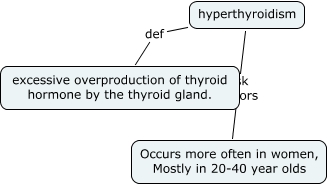 This Concept Map, created with IHMC CmapTools, has information related to: hyperthyroidism, hyperthyroidism def excessive overproduction of thyroid hormone by the thyroid gland., hyperthyroidism risk factors Occurs more often in women, Mostly in 20-40 year olds