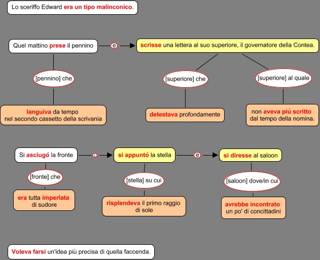 Questa Cmap, creata con IHMC CmapTools, contiene informazioni relative a: John 31, si diresse al saloon [saloon] dove/in cui avrebbe incontrato un po' di concittadini, scrisse una lettera al suo superiore, il governatore della Contea. [superiore] al quale non aveva più scritto dal tempo della nomina., Si asciugò la fronte , si appuntò la stella, scrisse una lettera al suo superiore, il governatore della Contea. [superiore] che detestava profondamente, Quel mattino prese il pennino [pennino] che languiva da tempo nel secondo cassetto della scrivania, si appuntò la stella e si diresse al saloon, si appuntò la stella [stella] su cui risplendeva il primo raggio di sole, Si asciugò la fronte [fronte] che era tutta imperlata di sudore, Quel mattino prese il pennino e scrisse una lettera al suo superiore, il governatore della Contea.