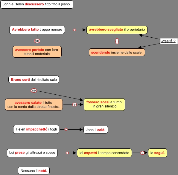Questa Cmap, creata con IHMC CmapTools, contiene informazioni relative a: John 23, irrealtà!? avrebbero svegliato il proprietario, Helen impacchettò i fogli , John li calò., Avrebbero fatto troppo rumore se avessero portato con loro tutto il materiale, irrealtà!? scendendo insieme dalle scale., Erano certi del risultato solo se avessero calato il tutto con la corda dalla stretta finestra., avrebbero svegliato il proprietario scendendo insieme dalle scale., avessero calato il tutto con la corda dalla stretta finestra. e fossero scesi a turno in gran silenzio, Lui prese gli attrezzi e scese , lei aspettò il tempo concordato, Avrebbero fatto troppo rumore , avrebbero svegliato il proprietario, Erano certi del risultato solo se fossero scesi a turno in gran silenzio, lei aspettò il tempo concordato e lo seguì.