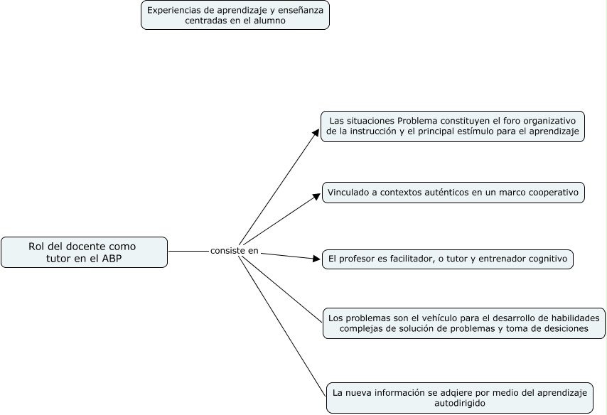 rol_docente_ABP, Rol del docente como tutor en el ABP consiste en Vinculado a contextos auténticos en un marco cooperativo, Rol del docente como tutor en el ABP consiste en Los problemas son el vehículo para el desarrollo de habilidades complejas de solución de problemas y toma de desiciones, Rol del docente como tutor en el ABP consiste en Las situaciones Problema constituyen el foro organizativo de la instrucción y el principal estímulo para el aprendizaje, Rol del docente como tutor en el ABP consiste en La nueva información se adqiere por medio del aprendizaje autodirigido, Rol del docente como tutor en el ABP consiste en El profesor es facilitador, o tutor y entrenador cognitivo