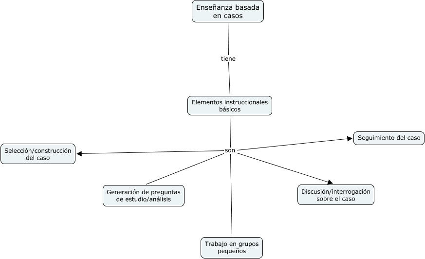 Enseñanza_basada_en_casos, Enseñanza basada en casos tiene Elementos instruccionales básicos, Elementos instruccionales básicos son Trabajo en grupos pequeños, Elementos instruccionales básicos son Selección/construcción del caso, Elementos instruccionales básicos son Discusión/interrogación sobre el caso, Elementos instruccionales básicos son Generación de preguntas de estudio/análisis, Elementos instruccionales básicos son Seguimiento del caso