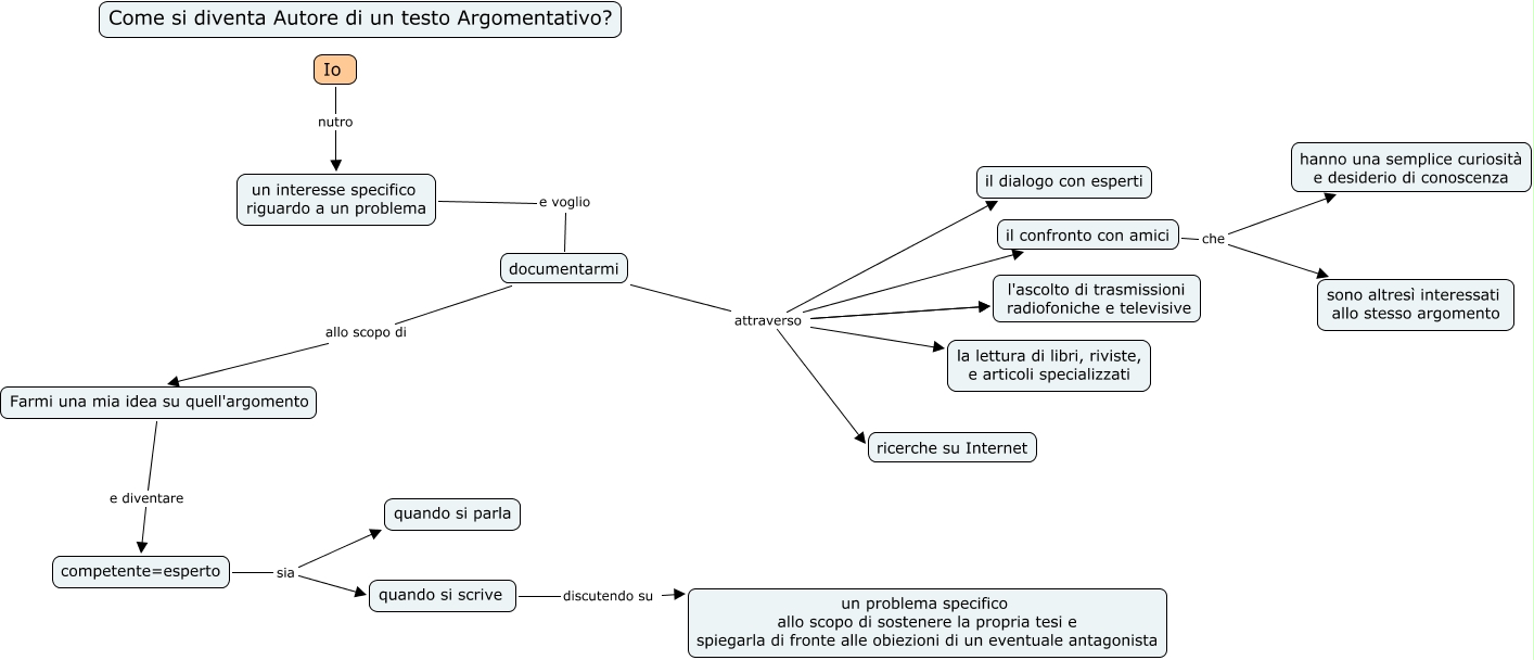 Questa Cmap, creata con IHMC CmapTools, contiene informazioni relative a: Testo Argomentativo, documentarmi attraverso la lettura di libri, riviste, e articoli specializzati, il confronto con amici che hanno una semplice curiosità e desiderio di conoscenza, documentarmi attraverso ricerche su Internet, documentarmi allo scopo di Farmi una mia idea su quell'argomento, documentarmi attraverso il confronto con amici, competente=esperto sia quando si scrive, documentarmi attraverso l'ascolto di trasmissioni radiofoniche e televisive, un interesse specifico riguardo a un problema e voglio documentarmi, Farmi una mia idea su quell'argomento e diventare competente=esperto, documentarmi attraverso il dialogo con esperti, Io nutro un interesse specifico riguardo a un problema, quando si scrive discutendo su un problema specifico allo scopo di sostenere la propria tesi e spiegarla di fronte alle obiezioni di un eventuale antagonista, competente=esperto sia quando si parla, documentarmi attraverso l'ascolto di trasmissioni radiofoniche e televisive, il confronto con amici che sono altresì interessati allo stesso argomento
