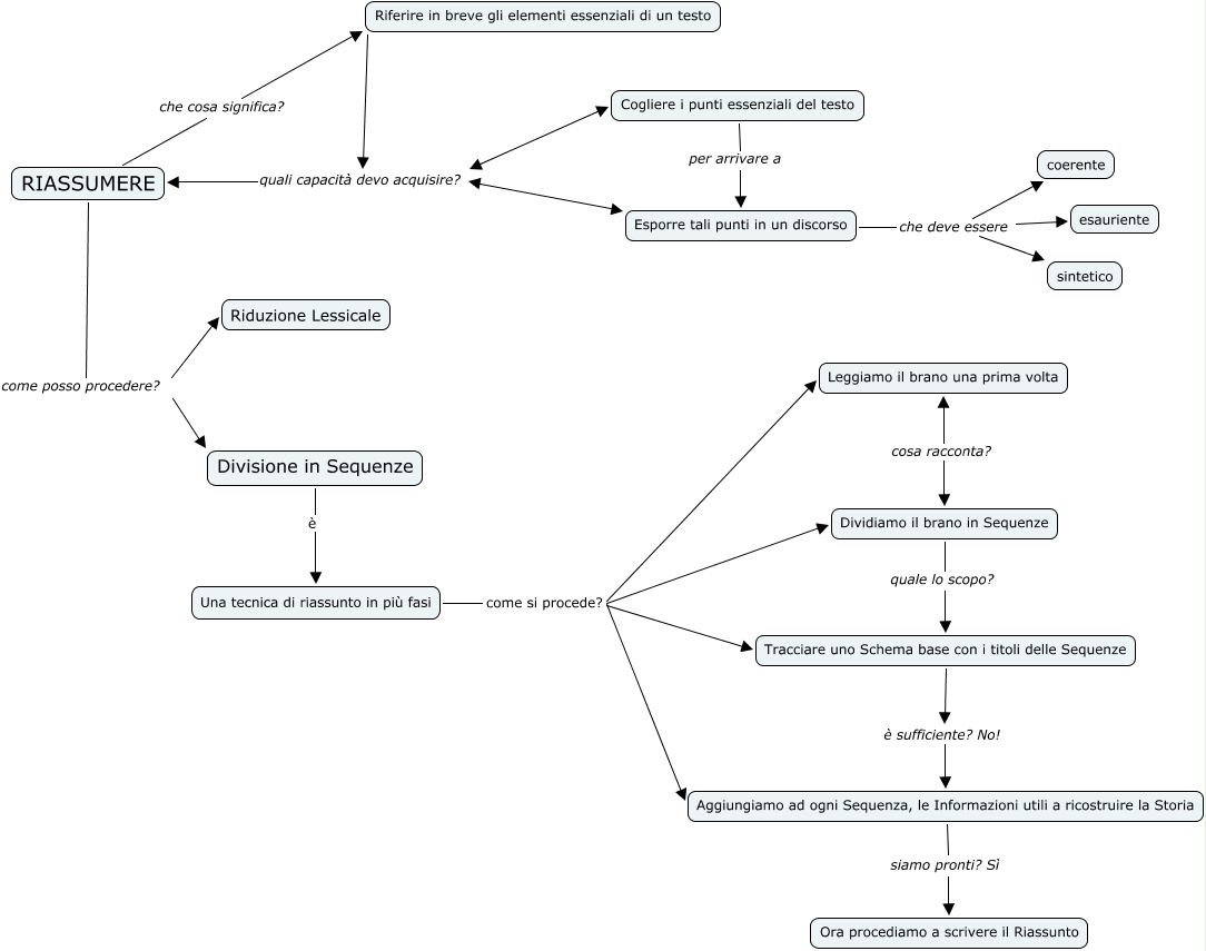Questa Cmap, creata con IHMC CmapTools, contiene informazioni relative a: Riassumere, Riferire in breve gli elementi essenziali di un testo quali capacità devo acquisire? RIASSUMERE, RIASSUMERE come posso procedere? Riduzione Lessicale, Una tecnica di riassunto in più fasi come si procede? Aggiungiamo ad ogni Sequenza, le Informazioni utili a ricostruire la Storia, Dividiamo il brano in Sequenze quale lo scopo? Tracciare uno Schema base con i titoli delle Sequenze, Aggiungiamo ad ogni Sequenza, le Informazioni utili a ricostruire la Storia siamo pronti? Sì Ora procediamo a scrivere il Riassunto, Esporre tali punti in un discorso che deve essere esauriente, Esporre tali punti in un discorso che deve essere coerente, RIASSUMERE come posso procedere? Divisione in Sequenze, RIASSUMERE che cosa significa? Riferire in breve gli elementi essenziali di un testo, Una tecnica di riassunto in più fasi come si procede? Dividiamo il brano in Sequenze, Esporre tali punti in un discorso che deve essere sintetico, Una tecnica di riassunto in più fasi come si procede? Tracciare uno Schema base con i titoli delle Sequenze, Riferire in breve gli elementi essenziali di un testo quali capacità devo acquisire? Cogliere i punti essenziali del testo, Tracciare uno Schema base con i titoli delle Sequenze è sufficiente? No! Aggiungiamo ad ogni Sequenza, le Informazioni utili a ricostruire la Storia, Una tecnica di riassunto in più fasi come si procede? Leggiamo il brano una prima volta, Cogliere i punti essenziali del testo per arrivare a Esporre tali punti in un discorso, Divisione in Sequenze è Una tecnica di riassunto in più fasi, Riferire in breve gli elementi essenziali di un testo quali capacità devo acquisire? Esporre tali punti in un discorso