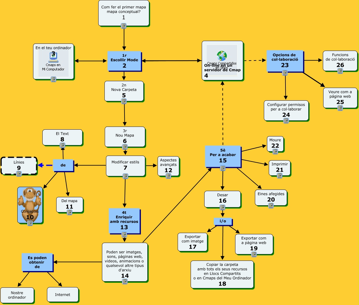 Aquest mapa conceptual conté informació relacionada amb: tutorialcmap, Com fer el primer mapa mapa conceptual? 1 1r Escollir Mode 2 2n Nova Carpeta 5, On-line en un servidor de Cmap 4 1r Escollir Mode 2 En el teu ordinador 3, On-line en un servidor de Cmap 4 Opcions de col·laboració 23 Funcions de col·laboració 26, Poden ser imatges, sons, pàginas web, videos, animacions o qualsevol altre tipus d'arxiu 14 Es poden obtenir de Internet, 3r Nou Mapa 6 Modificar estils 7, Poden ser imatges, sons, pàginas web, videos, animacions o qualsevol altre tipus d'arxiu 14 5è Per a acabar 15 On-line en un servidor de Cmap 4, Poden ser imatges, sons, pàginas web, videos, animacions o qualsevol altre tipus d'arxiu 14 5è Per a acabar 15 Moure 22, Modificar estils 7 de Conceptes 10, Desar 16 i/o Exportar com imatge 17, Modificar estils 7 de Del mapa 11, Modificar estils 7 de El Text 8, On-line en un servidor de Cmap 4 Opcions de col·laboració 23 Configurar permisos per a col·laborar 24, Desar 16 i/o Copiar la carpeta amb tots els seus recursos en Llocs Compartits o en Cmaps del Meu Ordinador 18, Modificar estils 7 de Línies 9, Modificar estils 7 4t Enriquir amb recursos 13 Poden ser imatges, sons, pàginas web, videos, animacions o qualsevol altre tipus d'arxiu 14, On-line en un servidor de Cmap 4 Opcions de col·laboració 23 Veure com a página web 25, Poden ser imatges, sons, pàginas web, videos, animacions o qualsevol altre tipus d'arxiu 14 Es poden obtenir de Nostre ordinador, Poden ser imatges, sons, pàginas web, videos, animacions o qualsevol altre tipus d'arxiu 14 5è Per a acabar 15 Imprimir 21, Poden ser imatges, sons, pàginas web, videos, animacions o qualsevol altre tipus d'arxiu 14 5è Per a acabar 15 Eines afegides 20, Modificar estils 7 Aspectes avançats 12