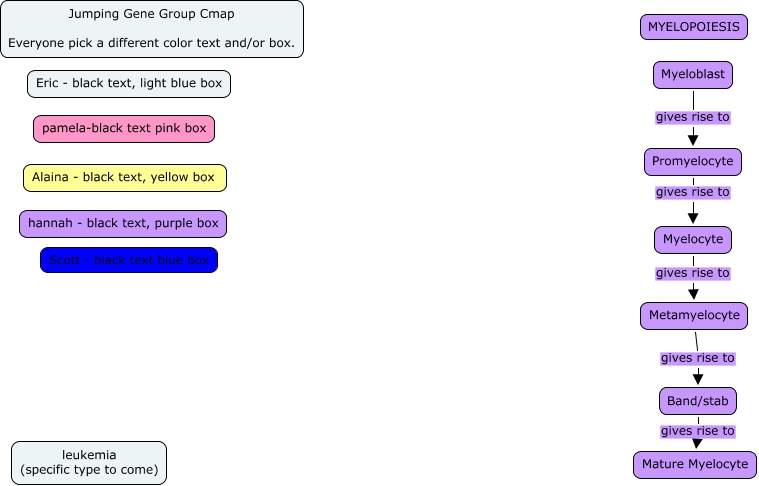 This Concept Map, created with IHMC CmapTools, has information related to: Jumping Genes, Metamyelocyte gives rise to Band/stab, Band/stab gives rise to Mature Myelocyte, Myelocyte gives rise to Metamyelocyte, Promyelocyte gives rise to Myelocyte, Myeloblast gives rise to Promyelocyte