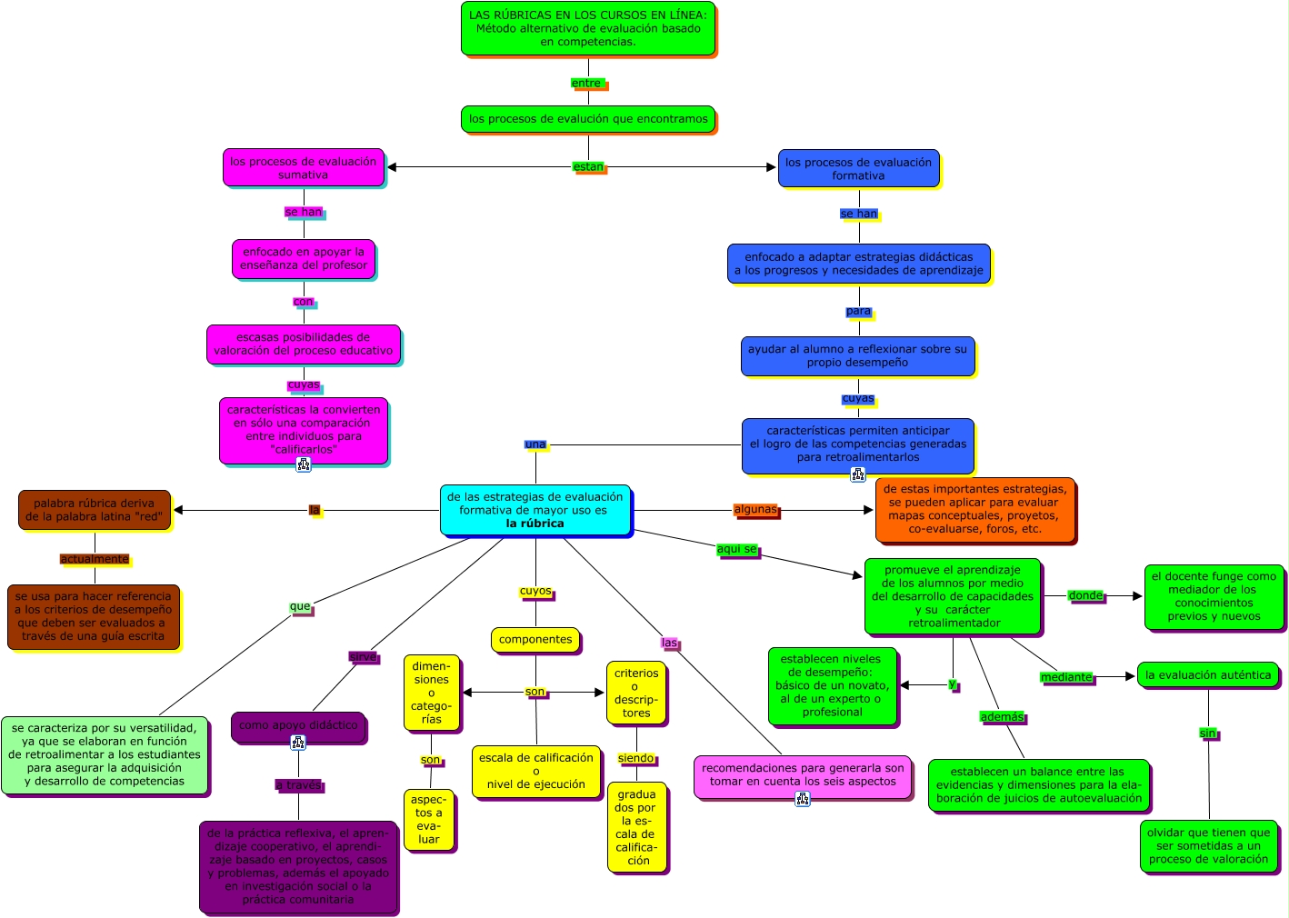 Este Cmap, tiene información relacionada con: las rúbricas.Foro5, palabra rúbrica deriva de la palabra latina "red" actualmente se usa para hacer referencia a los criterios de desempeño que deben ser evaluados a través de una guía escrita, LAS RÚBRICAS EN LOS CURSOS EN LÍNEA: Método alternativo de evaluación basado en competencias. entre los procesos de evalución que encontramos, de las estrategias de evaluación formativa de mayor uso es la rúbrica las recomendaciones para generarla son tomar en cuenta los seis aspectos, dimen- siones o catego- rías son aspec- tos a eva- luar, de las estrategias de evaluación formativa de mayor uso es la rúbrica sirve como apoyo didáctico, componentes son criterios o descrip- tores, componentes son dimen- siones o catego- rías, criterios o descrip- tores siendo gradua dos por la es- cala de califica- ción, características permiten anticipar el logro de las competencias generadas para retroalimentarlos una de las estrategias de evaluación formativa de mayor uso es la rúbrica, promueve el aprendizaje de los alumnos por medio del desarrollo de capacidades y su carácter retroalimentador donde el docente funge como mediador de los conocimientos previos y nuevos, enfocado a adaptar estrategias didácticas a los progresos y necesidades de aprendizaje para ayudar al alumno a reflexionar sobre su propio desempeño, de las estrategias de evaluación formativa de mayor uso es la rúbrica cuyos componentes, de las estrategias de evaluación formativa de mayor uso es la rúbrica aqui se promueve el aprendizaje de los alumnos por medio del desarrollo de capacidades y su carácter retroalimentador, los procesos de evaluación sumativa se han enfocado en apoyar la enseñanza del profesor, escasas posibilidades de valoración del proceso educativo cuyas características la convierten en sólo una comparación entre individuos para "calificarlos", componentes son escala de calificación o nivel de ejecución, promueve el aprendizaje de los alumnos por medio del desarrollo de capacidades y su carácter retroalimentador mediante la evaluación auténtica, los procesos de evaluación formativa se han enfocado a adaptar estrategias didácticas a los progresos y necesidades de aprendizaje, de las estrategias de evaluación formativa de mayor uso es la rúbrica algunas de estas importantes estrategias, se pueden aplicar para evaluar mapas conceptuales, proyetos, co-evaluarse, foros, etc., promueve el aprendizaje de los alumnos por medio del desarrollo de capacidades y su carácter retroalimentador además establecen un balance entre las evidencias y dimensiones para la ela- boración de juicios de autoevaluación