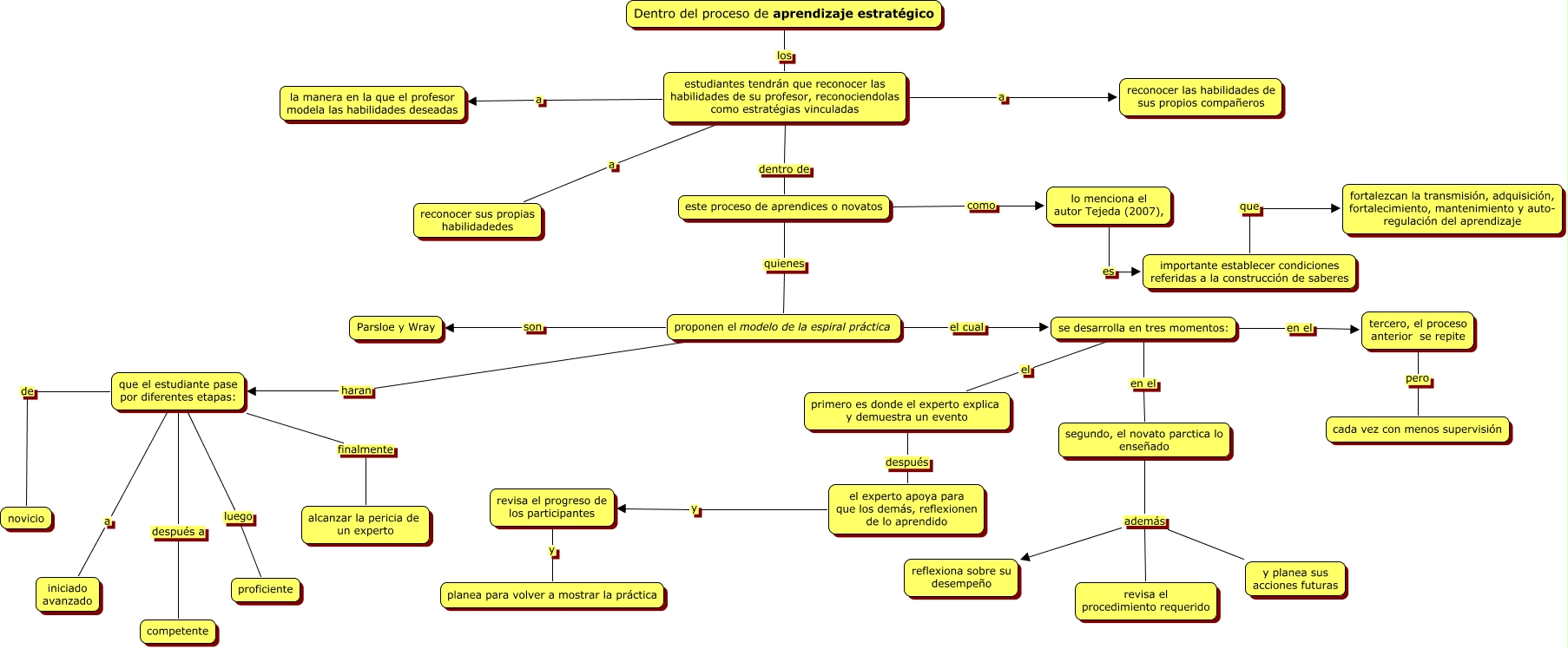 Este Cmap, tiene información relacionada con: aprendizaje estratégico.f1, segundo, el novato parctica lo enseñado además revisa el procedimiento requerido, lo menciona el autor Tejeda (2007), es importante establecer condiciones referidas a la construcción de saberes, el experto apoya para que los demás, reflexionen de lo aprendido y revisa el progreso de los participantes, revisa el progreso de los participantes y planea para volver a mostrar la práctica, estudiantes tendrán que reconocer las habilidades de su profesor, reconociendolas como estratégias vinculadas a reconocer las habilidades de sus propios compañeros, estudiantes tendrán que reconocer las habilidades de su profesor, reconociendolas como estratégias vinculadas dentro de este proceso de aprendices o novatos, primero es donde el experto explica y demuestra un evento después el experto apoya para que los demás, reflexionen de lo aprendido, importante establecer condiciones referidas a la construcción de saberes que fortalezcan la transmisión, adquisición, fortalecimiento, mantenimiento y auto- regulación del aprendizaje, este proceso de aprendices o novatos como lo menciona el autor Tejeda (2007),, proponen el modelo de la espiral práctica el cual se desarrolla en tres momentos:, tercero, el proceso anterior se repite pero cada vez con menos supervisión, este proceso de aprendices o novatos quienes proponen el modelo de la espiral práctica, que el estudiante pase por diferentes etapas: a iniciado avanzado, proponen el modelo de la espiral práctica son Parsloe y Wray, que el estudiante pase por diferentes etapas: después a competente, estudiantes tendrán que reconocer las habilidades de su profesor, reconociendolas como estratégias vinculadas a la manera en la que el profesor modela las habilidades deseadas, se desarrolla en tres momentos: en el segundo, el novato parctica lo enseñado, se desarrolla en tres momentos: el primero es donde el experto explica y demuestra un evento, que el estudiante pase por diferentes etapas: de novicio, que el estudiante pase por diferentes etapas: finalmente alcanzar la pericia de un experto