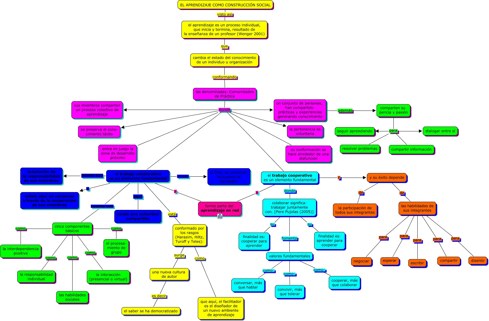 Este Cmap, tiene información relacionada con: aprendizaje construcción social.Foro2, valores fundamentales como: convivir, más que tolerar, las habilidades de sus integrantes para escribir, EL APRENDIZAJE COMO CONSTRUCCIÓN SOCIAL visto asi el aprendizaje es un proceso individual, que inicia y termina, resultado de la enseñanza de un profesor (Wenger 2001), las denominadas: Comunidades de Práctica donde el trabajo cooperativo es un elemento fundamental, valores fundamentales como: conversar, más que hablar, una nueva cultura de autor es decir el saber se ha democratizado, las habilidades de sus integrantes para disentir, cinco componentes básicos como la interacción (presencial o virtual), cambia el estado del conocimiento de un individuo u organización conformando las denominadas: Comunidades de Práctica, cinco componentes básicos como las habilidades sociales, comparten su pericia y pasión para compartir información, las habilidades de sus integrantes para esperar, las denominadas: Comunidades de Práctica donde sus miembros comparten un proceso colectivo de aprendizaje, las denominadas: Comunidades de Práctica donde el trabajo colaborativo es un elemento fundamental, las habilidades de sus integrantes para negociar, las denominadas: Comunidades de Práctica donde la pertenencia es voluntaria, y su éxito depende de la participación de todos sus integrantes, el trabajo colaborativo es un elemento fundamental cuenta con cinco componentes básicos, las habilidades de sus integrantes para compartir, conformado por los rasgos (Harasim, Hiltz, Turoff y Teles): surge una nueva cultura de autor