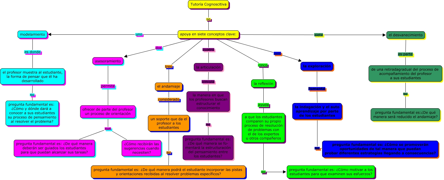 Este Cmap, tiene información relacionada con: tutoría cognoscitiva.f1, el desvanecimiento es parte de una retiradagradual del proceso de acompañamiento del profesor a sus estudiantes, apoya en siete conceptos clave: siete el desvanecimiento, modelamiento es donde el profesor muestra al estudiante, la forma de pensar que él ha desarrollado, la articulación vincula la manera en que los profesores buscan estructurar el conocimiento, apoya en siete conceptos clave: cinco la reflexión, Tutoría Cognoscitiva se apoya en siete conceptos clave:, la manera en que los profesores buscan estructurar el conocimiento su pregunta fundamental es: ¿De qué manera se fo- mentará la estructuración del pensamiento entre los estudiantes?, la indagación y el auto aprendizaje por parte de los estudiantes su pregunta fundamental es: ¿Cómo se promoverán oportunidades de tal manera que puedan probar diferentes estrategias llegando a consecuencias?, apoya en siete conceptos clave: seis la exploración, apoya en siete conceptos clave: uno modelamiento, de una retiradagradual del proceso de acompañamiento del profesor a sus estudiantes su pregunta fundamental es:¿De qué manera será reducido el andamiaje?, ofrecer de parte del profesor un proceso de orientación sus pregunta fundamental es: ¿De qué manera deberán ser guiados los estudiantes para que puedan alcanzar sus tareas?, ofrecer de parte del profesor un proceso de orientación sus ¿Cómo recibirán las sugerencias cuando necesiten?, asesoramiento permite ofrecer de parte del profesor un proceso de orientación, el andamiaje considerado un soporte que da el profesor a los estudiantes, apoya en siete conceptos clave: tres el andamiaje, apoya en siete conceptos clave: dos asesoramiento, a que los estudiantes comparen su propio proceso de resolución de problemas con el de los expertos u otros compañeros su pregunta fundamental es: ¿Cómo motivar a los estudiantes para que examinen sus esfuerzos?, apoya en siete conceptos clave: cuatro la articulación, la exploración fomenta la indagación y el auto aprendizaje por parte de los estudiantes