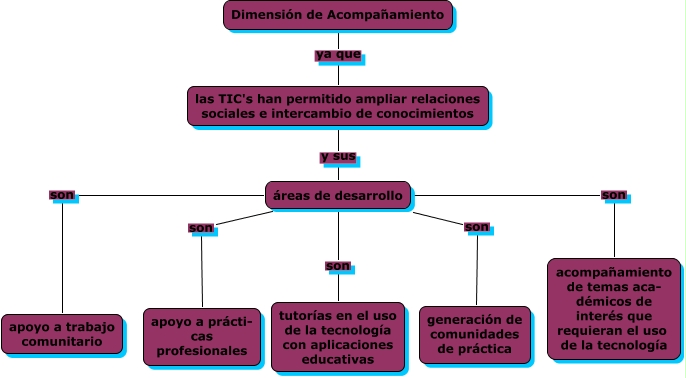 Este Cmap, tiene información relacionada con: dimension2.f3, áreas de desarrollo son generación de comunidades de práctica, áreas de desarrollo son tutorías en el uso de la tecnología con aplicaciones educativas, las TIC's han permitido ampliar relaciones sociales e intercambio de conocimientos y sus áreas de desarrollo, áreas de desarrollo son acompañamiento de temas aca- démicos de interés que requieran el uso de la tecnología, áreas de desarrollo son apoyo a trabajo comunitario, Dimensión de Acompañamiento ya que las TIC's han permitido ampliar relaciones sociales e intercambio de conocimientos, áreas de desarrollo son apoyo a prácti- cas profesionales