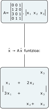 0 1 1 </mtext> </mfenced> <mtext> . </mtext> <mfenced open="|" close="|"> <mmultiscripts> <mtext> x </mtext> <mtext> 1 </mtext> <none/> </mmultiscripts> <mtext> </mtext> <mmultiscripts> <mtext> x </mtext> <mtext> 2 </mtext> <none/> </mmultiscripts> <mtext> </mtext> <mmultiscripts> <mtext> x </mtext> <mtext> 3 </mtext> <none/> </mmultiscripts> </mfenced> </mrow> </math> <math xmlns="http://www.w3.org/1998/Math/MathML"> <mrow> <munderover> <mtext> x </mtext> <none/> <mtext> → </mtext> </munderover> <mtext> → A </mtext> <munderover> <mtext> x </mtext> <none/> <mtext> → </mtext> </munderover> <mtext> funtzioa: </mtext> </mrow> </math> <math xmlns="http://www.w3.org/1998/Math/MathML"> <mrow> <mfenced open="|" close=""> <mtext> </mtext> </mfenced> <mtable> <mtr> <mtd> <mtext> </mtext> </mtd> <mtd> <mtext> </mtext> </mtd> <mtd> <mtext> </mtext> </mtd> <mtd> <mmultiscripts> <mtext> x </mtext> <mtext> 3 </mtext> <none/> </mmultiscripts> </mtd> </mtr> <mtr> <mtd> <mmultiscripts> <mtext> x </mtext> <mtext> 1 </mtext> <none/> </mmultiscripts> </mtd> <mtd> <mtext> + </mtext> </mtd> <mtd> <mtext> 2 </mtext> <mmultiscripts> <mtext> x </mtext> <mtext> 2 </mtext> <none/> </mmultiscripts> </mtd> <mtd> <mtext> </mtext> </mtd> </mtr> <mtr> <mtd> <mtext> 3 </mtext> <mmultiscripts> <mtext> x </mtext> <mtext> 1 </mtext> <none/> </mmultiscripts> </mtd> <mtd> <mtext> + </mtext> </mtd> <mtd> <mtext> </mtext> </mtd> <mtd> <mmultiscripts> <mtext> x </mtext> <mtext> 3 </mtext> <none/> </mmultiscripts> </mtd> </mtr> <mtr> <mtd> <mtext> </mtext> </mtd> <mtd> <mtext> </mtext> </mtd> <mtd> <mmultiscripts> <mtext> x </mtext> <mtext> 2 </mtext> <none/> </mmultiscripts> <mtext> + </mtext> </mtd> <mtd> <mmultiscripts> <mtext> x </mtext> <mtext> 3 </mtext> <none/> </mmultiscripts> </mtd> </mtr> </mtable> <mfenced open="" close="|"> <mtext> </mtext> </mfenced> </mrow> </math>