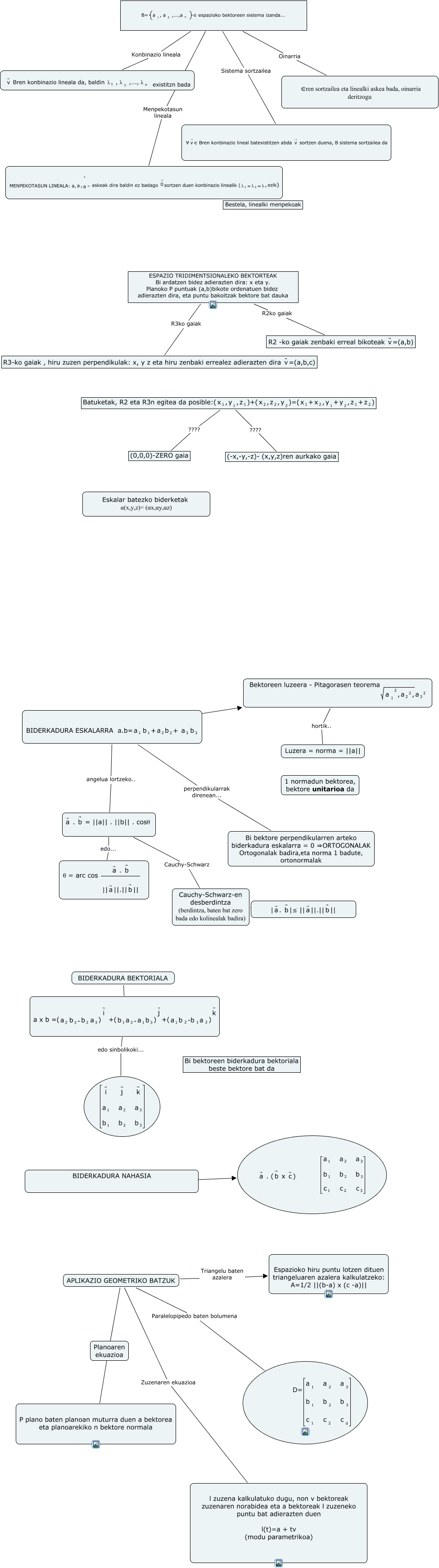 (modu parametrikoa) </mtext> </mrow> </math>, <math xmlns="http://www.w3.org/1998/Math/MathML"> <mrow> <mtext> B= </mtext> <mfenced open="{" close=""> <mtext> a </mtext> <mmultiscripts> <mtext> </mtext> <mtext> 1 </mtext> <none/> </mmultiscripts> </mfenced> <mtext> , a </mtext> <mmultiscripts> <mtext> </mtext> <mtext> 2 </mtext> <none/> </mmultiscripts> <mtext> ,...,a </mtext> <mmultiscripts> <mtext> </mtext> <mtext> n </mtext> <none/> </mmultiscripts> <mfenced open="" close="}"> <mtext> </mtext> </mfenced> <mtext> ∈ espazioko bektoreen sistema izanda... </mtext> </mrow> </math> Sistema sortzailea <math xmlns="http://www.w3.org/1998/Math/MathML"> <mrow> <mtext> ∀ </mtext> <munderover> <mtext> v </mtext> <none/> <mtext> → </mtext> </munderover> <mtext> ∈ Bren konbinazio lineal batexistitzen abda </mtext> <munderover> <mtext> v </mtext> <none/> <mtext> → </mtext> </munderover> <mtext> sortzen duena, B sistema sortzailea da </mtext> </mrow> </math>, <math xmlns="http://www.w3.org/1998/Math/MathML"> <mrow> <mtext> Batuketak, R2 eta R3n egitea da posible:( </mtext> <mmultiscripts> <mtext> x </mtext> <mtext> 1 </mtext> <none/> </mmultiscripts> <mtext> , </mtext> <mmultiscripts> <mtext> y </mtext> <mtext> 1 </mtext> <none/> </mmultiscripts> <mtext> , </mtext> <mmultiscripts> <mtext> z </mtext> <mtext> 1 </mtext> <none/> </mmultiscripts> <mtext> )+( </mtext> <mmultiscripts> <mtext> x </mtext> <mtext> 2 </mtext> <none/> </mmultiscripts> <mtext> , </mtext> <mmultiscripts> <mtext> z </mtext> <mtext> 2 </mtext> <none/> </mmultiscripts> <mtext> , </mtext> <mmultiscripts> <mtext> y </mtext> <mtext> 2 </mtext> <none/> </mmultiscripts> <mtext> )=( </mtext> <mmultiscripts> <mtext> x </mtext> <mtext> 1 </mtext> <none/> </mmultiscripts> <mtext> + </mtext> <mmultiscripts> <mtext> x </mtext> <mtext> 2 </mtext> <none/> </mmultiscripts> <mtext> , </mtext> <mmultiscripts> <mtext> y </mtext> <mtext> 1 </mtext> <none/> </mmultiscripts> <mtext> + </mtext> <mmultiscripts> <mtext> y </mtext> <mtext> 2 </mtext> <none/> </mmultiscripts> <mtext> , </mtext> <mmultiscripts> <mtext> z </mtext> <mtext> 1 </mtext> <none/> </mmultiscripts> <mtext> + </mtext> <mmultiscripts> <mtext> z </mtext> <mtext> 2 </mtext> <none/> </mmultiscripts> <mtext> ) </mtext> </mrow> </math> ???? (-x,-y,-z)- (x,y,z)ren aurkako gaia, Cauchy-Schwarz-en desberdintza (berdintza, baten bat zero bada edo kolinealak badira) ???? <math xmlns="http://www.w3.org/1998/Math/MathML"> <mrow> <mtext> | </mtext> <munderover> <mtext> a </mtext> <none/> <mtext> → </mtext> </munderover> <mtext> . </mtext> <munderover> <mtext> b </mtext> <none/> <mtext> → </mtext> </munderover> <mtext> |≤ || </mtext> <munderover> <mtext> a </mtext> <none/> <mtext> → </mtext> </munderover> <mtext> ||.|| </mtext> <munderover> <mtext> b </mtext> <none/> <mtext> → </mtext> </munderover> <mtext> || </mtext> </mrow> </math>, BIDERKADURA BEKTORIALA ???? <math xmlns="http://www.w3.org/1998/Math/MathML"> <mrow> <mtext>