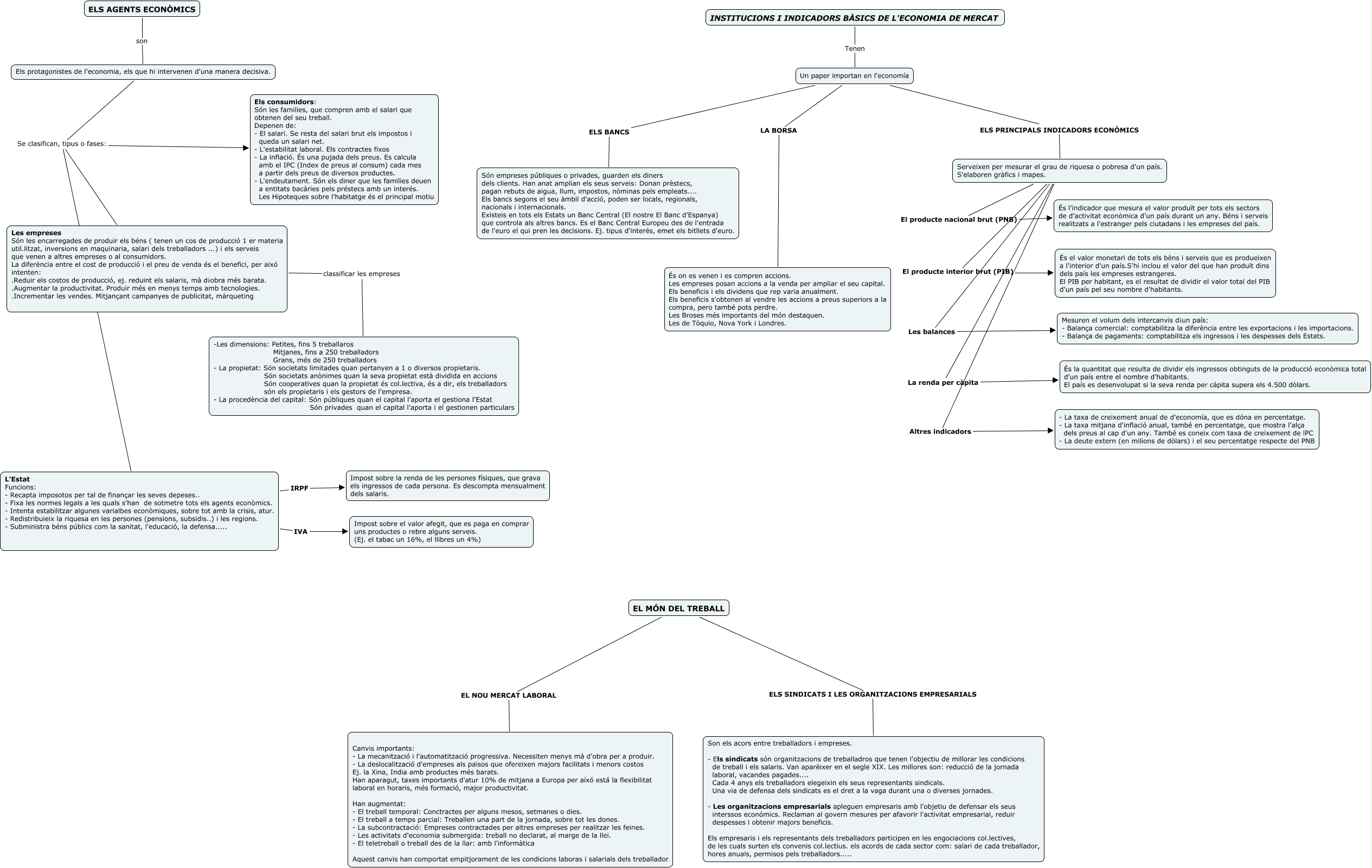 Este Cmap, tiene información relacionada con: TEMA 3 - ACTIVITAT ECONÒMICA 3-4-5, EL MÓN DEL TREBALL EL NOU MERCAT LABORAL Canvis importants: - La mecanització i l'automatització progressiva. Necessiten menys mà d'obra per a produir. - La deslocalització d'empreses als països que ofereixen majors facilitats i menors costos Ej. la Xina, India amb productes més barats. Han aparagut, taxes importants d'atur 10% de mitjana a Europa per aixó está la flexibilitat laboral en horaris, més formació, major productivitat. Han augmentat: - El treball temporal: Conctractes per alguns mesos, setmanes o dies. - El treball a temps parcial: Treballen una part de la jornada, sobre tot les dones. - La subcontractació: Empreses contractades per altres empreses per realitzar les feines. - Les activitats d'economia submergida: treball no declarat, al marge de la llei. - El teletreball o treball des de la llar: amb l'informàtica Aquest canvis han comportat empitjorament de les condicions laboras i salarials dels treballador, Serveixen per mesurar el grau de riquesa o pobresa d'un país. S'elaboren gràfics i mapes. Les balances Mesuren el volum dels intercanvis d¡un país: - Balança comercial: comptabilitza la diferència entre les exportacions i les importacions. - Balança de pagaments: comptabilitza els ingressos i les despesses dels Estats., Les empreses Són les encarregades de produir els béns ( tenen un cos de producció 1 er materia util.litzat, inversions en maquinaria, salari dels treballadors ...) i els serveis que venen a altres empreses o al consumidors. La diferència entre el cost de producció i el preu de venda és el benefici, per aixó intenten: .Reduir els costos de producció, ej. reduint els salaris, mà d¡obra més barata. .Augmentar la productivitat. Produir més en menys temps amb tecnologies. .Incrementar les vendes. Mitjançant campanyes de publicitat, màrqueting classificar les empreses -Les dimensions: Petites, fins 5 treballaros Mitjanes, fins a 250 treballadors Grans, més de 250 treballadors - La propietat: Són societats limitades quan pertanyen a 1 o diversos propietaris. Són societats anònimes quan la seva propietat està dividida en accions Són cooperatives quan la propietat és col.lectiva, és a dir, els treballadors són els propietaris i els gestors de l'empresa. - La procedència del capital: Són públiques quan el capital l'aporta el gestiona l'Estat Són privades quan el capital l'aporta i el gestionen particulars, L'Estat Funcions: - Recapta imposotos per tal de finançar les seves depeses.. - Fixa les normes legals a les quals s'han de sotmetre tots els agents econòmics. - Intenta estabilitzar algunes varialbes econòmiques, sobre tot amb la crisis, atur. - Redistribuieix la riquesa en les persones (pensions, subsidis..) i les regions. - Subministra béns públics com la sanitat, l'educació, la defensa..... IVA Impost sobre el valor afegit, que es paga en comprar uns productes o rebre alguns serveis. (Ej. el tabac un 16%, el llibres un 4%), INSTITUCIONS I INDICADORS BÀSICS DE L'ECONOMIA DE MERCAT Tenen Un paper importan en l'economía, Els protagonistes de l'economia, els que hi intervenen d'una manera decisiva. Se clasifican, tipus o fases: Els consumidors: Són les families, que compren amb el salari que obtenen del seu treball. Depenen de: - El salari. Se resta del salari brut els impostos i queda un salari net. - L'estabilitat laboral. Els contractes fixos - La inflació. És una pujada dels preus. Es calcula amb el IPC (Index de preus al consum) cada mes a partir dels preus de diversos productes. - L'endeutament. Són els diner que les families deuen a entitats bacàries pels préstecs amb un interés. Les Hipoteques sobre l'habitatge és el principal motiu, Un paper importan en l'economía ELS BANCS Són empreses públiques o privades, guarden els diners dels clients. Han anat amplian els seus serveis: Donan prèstecs, pagan rebuts de aigua, llum, impostos, nòminas pels empleats.... Els bancs segons el seu àmbil d'acció, poden ser locals, regionals, nacionals i internacionals. Existeis en tots els Estats un Banc Central (El nostre El Banc d'Espanya) que controla als altres bancs. Es el Banc Central Europeu des de l'entrada de l'euro el qui pren les decisions. Ej. tipus d'interés, emet els bitllets d'euro., Els protagonistes de l'economia, els que hi intervenen d'una manera decisiva. Se clasifican, tipus o fases: Les empreses Són les encarregades de produir els béns ( tenen un cos de producció 1 er materia util.litzat, inversions en maquinaria, salari dels treballadors ...) i els serveis que venen a altres empreses o al consumidors. La diferència entre el cost de producció i el preu de venda és el benefici, per aixó intenten: .Reduir els costos de producció, ej. reduint els salaris, mà d¡obra més barata. .Augmentar la productivitat. Produir més en menys temps amb tecnologies. .Incrementar les vendes. Mitjançant campanyes de publicitat, màrqueting, Un paper importan en l'economía ELS PRINCIPALS INDICADORS ECONÒMICS Serveixen per mesurar el grau de riquesa o pobresa d'un país. S'elaboren gràfics i mapes., Serveixen per mesurar el grau de riquesa o pobresa d'un país. S'elaboren gràfics i mapes. Altres indicadors - La taxa de creixement anual de d'economía, que es dóna en percentatge. - La taxa mitjana d'inflació anual, també en percentatge, que mostra l'alça dels preus al cap d'un any. També es coneix com taxa de creixement de lPC - La deute extern (en milions de dòlars) i el seu percentatge respecte del PNB, EL MÓN DEL TREBALL ELS SINDICATS I LES ORGANITZACIONS EMPRESARIALS Son els acors entre treballadors i empreses. - Els sindicats són organitzacions de treballadros que tenen l'objectiu de millorar les condicions de treball i els salaris. Van aparèixer en el segle XIX. Les millores son: reducció de la jornada laboral, vacandes pagades.... Cada 4 anys els treballadors elegeixin els seus representants 