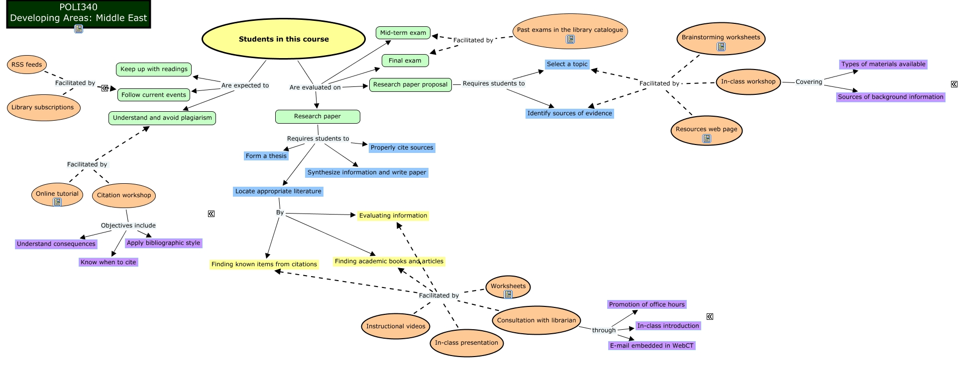 This Concept Map, created with IHMC CmapTools, has information related to: POLI340, Students in this course Are expected to Follow current events, Students in this course Are evaluated on Research paper, Worksheets Facilitated by Finding academic books and articles, Students in this course Are evaluated on Mid-term exam, Resources web page Facilitated by Identify sources of evidence, Citation workshop Objectives include Apply bibliographic style, Citation workshop Facilitated by Understand and avoid plagiarism, Locate appropriate literature By Evaluating information, Research paper Requires students to Form a thesis, Citation workshop Objectives include Know when to cite, Instructional videos Facilitated by Finding academic books and articles, Worksheets Facilitated by Finding known items from citations, Brainstorming worksheets Facilitated by Identify sources of evidence, Consultation with librarian through E-mail embedded in WebCT, In-class presentation Facilitated by Finding known items from citations, In-class presentation Facilitated by Evaluating information, Citation workshop Objectives include Understand consequences, Students in this course Are expected to Understand and avoid plagiarism, In-class presentation Facilitated by Finding academic books and articles, Locate appropriate literature By Finding academic books and articles