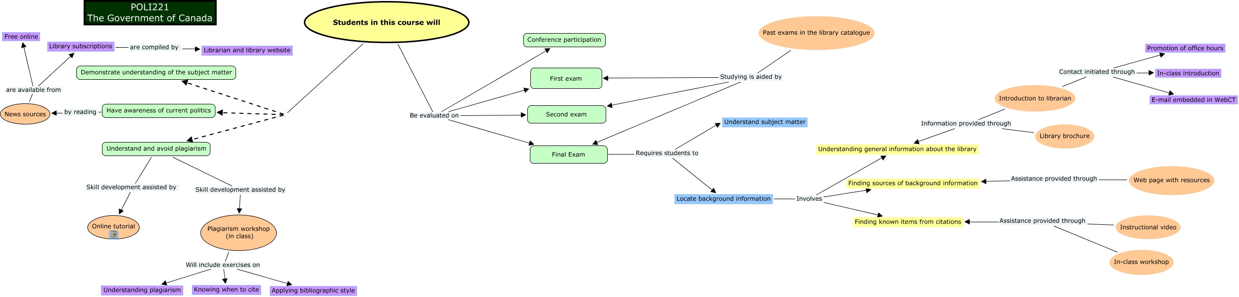 This Concept Map, created with IHMC CmapTools, has information related to: POLI221, Library subscriptions are compiled by Librarian and library website, Web page with resources Assistance provided through Finding sources of background information, Students in this course will Be evaluated on Final Exam, Students in this course will Have awareness of current politics, Introduction to librarian Information provided through Understanding general information about the library, Students in this course will Be evaluated on First exam, News sources are available from Free online, Plagiarism workshop (in class) Will include exercises on Applying bibliographic style, Plagiarism workshop (in class) Will include exercises on Knowing when to cite, Library brochure Information provided through Understanding general information about the library, Locate background information Involves Understanding general information about the library, Understand and avoid plagiarism Skill development assisted by Online tutorial, Introduction to librarian Contact initiated through E-mail embedded in WebCT, Past exams in the library catalogue Studying is aided by Final Exam, Students in this course will Understand and avoid plagiarism, Plagiarism workshop (in class) Will include exercises on Understanding plagiarism, Locate background information Involves Finding sources of background information, In-class workshop Assistance provided through Finding known items from citations, Have awareness of current politics by reading News sources, Past exams in the library catalogue Studying is aided by First exam