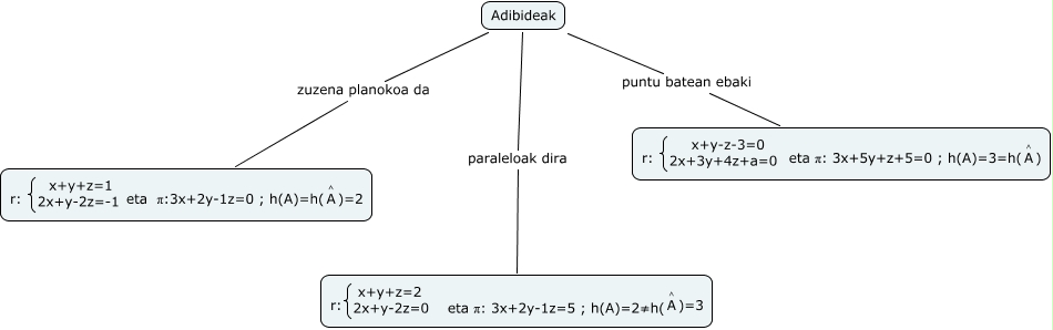 2x+3y+4z+a=0 </mtext> </mfenced> <mtext> eta π: 3x+5y+z+5=0 ; h(A)=3=h( </mtext> <munderover> <mtext> A </mtext> <none/> <mtext> ∧ </mtext> </munderover> <mtext> ) </mtext> </mrow> </math>, Adibideak paraleloak dira <math xmlns="http://www.w3.org/1998/Math/MathML"> <mrow> <mtext> r: </mtext> <mfenced open="{" close=""> <mtext> x+y+z=2