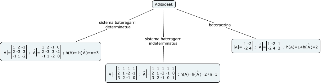 -2 4 2 </mtext> </mfenced> <mtext> ; h(A)=1≠h( </mtext> <munderover> <mtext> A </mtext> <none/> <mtext> ∧ </mtext> </munderover> <mtext> )=2 </mtext> </mrow> </math>, Adibideak sistema bateragarri indeterminatua <math xmlns="http://www.w3.org/1998/Math/MathML"> <mrow> <mfenced open="|" close="|"> <mtext> A </mtext> </mfenced> <mtext> = </mtext> <mfenced open="|" close="|"> <mtext> 1 1 1 1