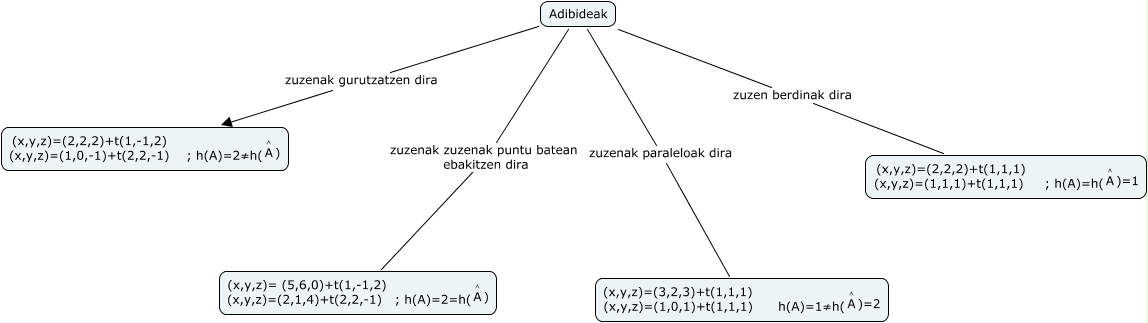 (x,y,z)=(1,0,1)+t(1,1,1) h(A)=1≠h( </mtext> <munderover> <mtext> A </mtext> <none/> <mtext> ∧ </mtext> </munderover> <mtext> )=2 </mtext> </mrow> </math>, Adibideak zuzenak zuzenak puntu batean ebakitzen dira <math xmlns="http://www.w3.org/1998/Math/MathML"> <mrow> <mtext> (x,y,z)= (5,6,0)+t(1,-1,2)