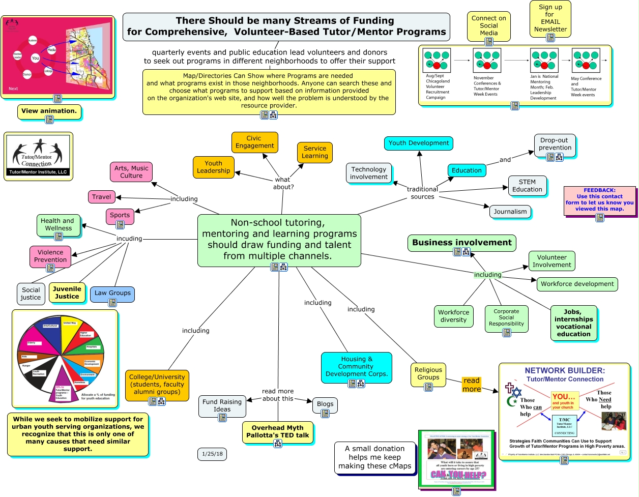 This Concept Map, created with IHMC CmapTools, has information related to: Funding Stream, Non-school tutoring, mentoring and learning programs should draw funding and talent from multiple channels. traditional sources STEM Education, Non-school tutoring, mentoring and learning programs should draw funding and talent from multiple channels. incuding Violence Prevention, Non-school tutoring, mentoring and learning programs should draw funding and talent from multiple channels. traditional sources Technology involvement, Non-school tutoring, mentoring and learning programs should draw funding and talent from multiple channels. traditional sources Journalism, Non-school tutoring, mentoring and learning programs should draw funding and talent from multiple channels. including Corporate Social Responsibility, Religious Groups read more, Non-school tutoring, mentoring and learning programs should draw funding and talent from multiple channels. what about? Service Learning, Non-school tutoring, mentoring and learning programs should draw funding and talent from multiple channels. incuding Social justice, Non-school tutoring, mentoring and learning programs should draw funding and talent from multiple channels. including Volunteer Involvement, Non-school tutoring, mentoring and learning programs should draw funding and talent from multiple channels. including Business involvement, Non-school tutoring, mentoring and learning programs should draw funding and talent from multiple channels. traditional sources Education, Non-school tutoring, mentoring and learning programs should draw funding and talent from multiple channels. what about? Civic Engagement, Non-school tutoring, mentoring and learning programs should draw funding and talent from multiple channels. including Jobs, internships vocational education, Education and Drop-out prevention, Non-school tutoring, mentoring and learning programs should draw funding and talent from multiple channels. read more about this Blogs, Non-school tutoring, mentoring and learning programs should draw funding and talent from multiple channels. read more about this Fund Raising Ideas, Non-school tutoring, mentoring and learning programs should draw funding and talent from multiple channels. including Housing & Community Development Corps., Non-school tutoring, mentoring and learning programs should draw funding and talent from multiple channels. including Workforce development, Non-school tutoring, mentoring and learning programs should draw funding and talent from multiple channels. read more about this Overhead Myth Pallotta's TED talk, Non-school tutoring, mentoring and learning programs should draw funding and talent from multiple channels. incuding Law Groups