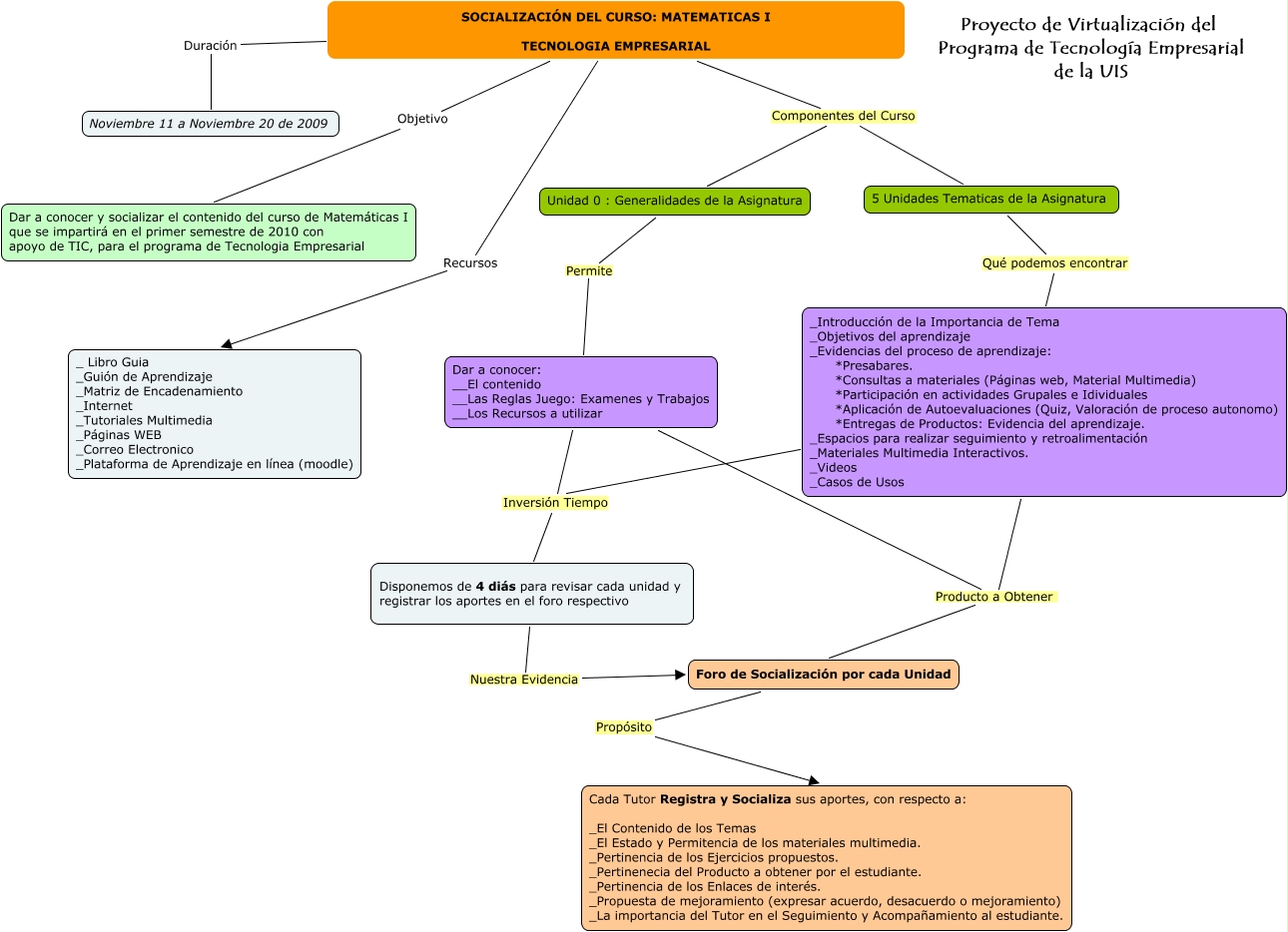 Este Cmap, tiene información relacionada con: Socialización del Curso de Matematicas, Dar a conocer: __El contenido __Las Reglas Juego: Examenes y Trabajos __Los Recursos a utilizar Producto a Obtener Foro de Socialización por cada Unidad, Disponemos de 4 diás para revisar cada unidad y registrar los aportes en el foro respectivo Nuestra Evidencia Foro de Socialización por cada Unidad, 5 Unidades Tematicas de la Asignatura Qué podemos encontrar _Introducción de la Importancia de Tema _Objetivos del aprendizaje _Evidencias del proceso de aprendizaje: *Presabares. *Consultas a materiales (Páginas web, Material Multimedia) *Participación en actividades Grupales e Idividuales *Aplicación de Autoevaluaciones (Quiz, Valoración de proceso autonomo) *Entregas de Productos: Evidencia del aprendizaje. _Espacios para realizar seguimiento y retroalimentación _Materiales Multimedia Interactivos. _Videos _Casos de Usos, SOCIALIZACIÓN DEL CURSO: MATEMATICAS I TECNOLOGIA EMPRESARIAL Componentes del Curso 5 Unidades Tematicas de la Asignatura, Dar a conocer: __El contenido __Las Reglas Juego: Examenes y Trabajos __Los Recursos a utilizar Inversión Tiempo Disponemos de 4 diás para revisar cada unidad y registrar los aportes en el foro respectivo, SOCIALIZACIÓN DEL CURSO: MATEMATICAS I TECNOLOGIA EMPRESARIAL Recursos _ Libro Guia _Guión de Aprendizaje _Matriz de Encadenamiento _Internet _Tutoriales Multimedia _Páginas WEB _Correo Electronico _Plataforma de Aprendizaje en línea (moodle), Foro de Socialización por cada Unidad Propósito Cada Tutor Registra y Socializa sus aportes, con respecto a: _El Contenido de los Temas _El Estado y Permitencia de los materiales multimedia. _Pertinencia de los Ejercicios propuestos. _Pertinenecia del Producto a obtener por el estudiante. _Pertinencia de los Enlaces de interés. _Propuesta de mejoramiento (expresar acuerdo, desacuerdo o mejoramiento) _La importancia del Tutor en el Seguimiento y Acompañamiento al estudiante., Unidad 0 : Generalidades de la Asignatura Permite Dar a conocer: __El contenido __Las Reglas Juego: Examenes y Trabajos __Los Recursos a utilizar, _Introducción de la Importancia de Tema _Objetivos del aprendizaje _Evidencias del proceso de aprendizaje: *Presabares. *Consultas a materiales (Páginas web, Material Multimedia) *Participación en actividades Grupales e Idividuales *Aplicación de Autoevaluaciones (Quiz, Valoración de proceso autonomo) *Entregas de Productos: Evidencia del aprendizaje. _Espacios para realizar seguimiento y retroalimentación _Materiales Multimedia Interactivos. _Videos _Casos de Usos Producto a Obtener Foro de Socialización por cada Unidad, SOCIALIZACIÓN DEL CURSO: MATEMATICAS I TECNOLOGIA EMPRESARIAL Duración Noviembre 11 a Noviembre 20 de 2009, SOCIALIZACIÓN DEL CURSO: MATEMATICAS I TECNOLOGIA EMPRESARIAL Componentes del Curso Unidad 0 : Generalidades de la Asignatura, _Introducción de la Importancia de Tema _Objetivos del aprendizaje _Evidencias del proceso de aprendizaje: *Presabares. *Consultas a materiales (Páginas web, Material Multimedia) *Participación en actividades Grupales e Idividuales *Aplicación de Autoevaluaciones (Quiz, Valoración de proceso autonomo) *Entregas de Productos: Evidencia del aprendizaje. _Espacios para realizar seguimiento y retroalimentación _Materiales Multimedia Interactivos. _Videos _Casos de Usos Inversión Tiempo Disponemos de 4 diás para revisar cada unidad y registrar los aportes en el foro respectivo, SOCIALIZACIÓN DEL CURSO: MATEMATICAS I TECNOLOGIA EMPRESARIAL Objetivo Dar a conocer y socializar el contenido del curso de Matemáticas I que se impartirá en el primer semestre de 2010 con apoyo de TIC, para el programa de Tecnologia Empresarial