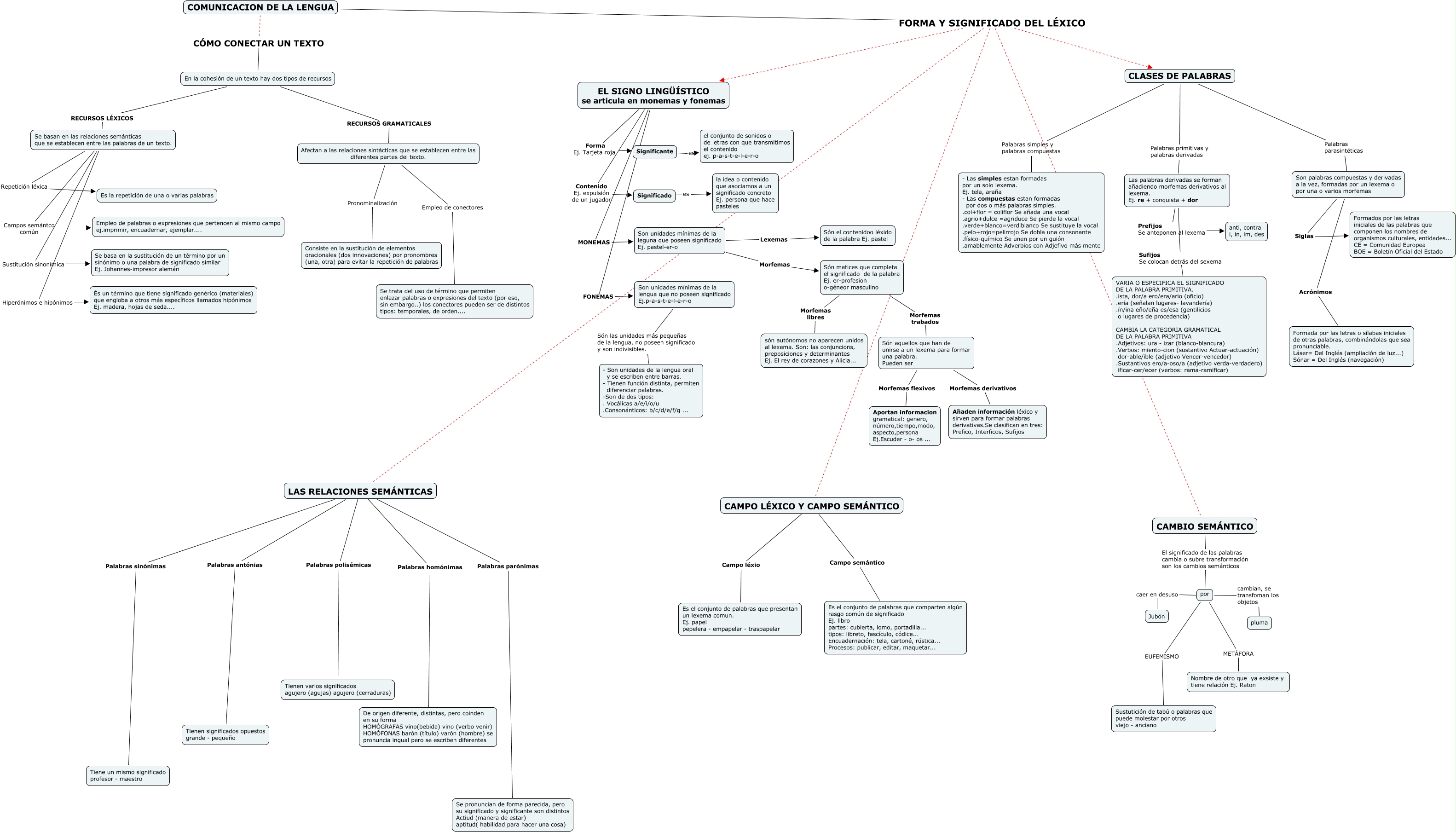Este Cmap, tiene información relacionada con: TEMA I, Són matices que completa el significado de la palabra Ej. er-profesion o-géneor masculino Morfemas trabados Són aquellos que han de unirse a un lexema para formar una palabra. Pueden ser, por cambian, se transfoman los objetos pluma, EL SIGNO LINGÜÍSTICO se articula en monemas y fonemas FONEMAS Son unidades mínimas de la lengua que no poseen significado Ej.p-a-s-t-e-l-e-r-o, EL SIGNO LINGÜÍSTICO se articula en monemas y fonemas Contenido Ej. expulsión de un jugador Significado, Son unidades mínimas de la leguna que poseen significado Ej. pastel-er-o Morfemas Són matices que completa el significado de la palabra Ej. er-profesion o-géneor masculino, Son unidades mínimas de la leguna que poseen significado Ej. pastel-er-o Lexemas Són el contenidoo léxido de la palabra Ej. pastel, Són aquellos que han de unirse a un lexema para formar una palabra. Pueden ser Morfemas derivativos Añaden información léxico y sirven para formar palabras derivativas.Se clasifican en tres: Prefico, Interficos, Sufijos, por caer en desuso Jubón, LAS RELACIONES SEMÁNTICAS Palabras polisémicas Tienen varios significados agujero (agujas) agujero (cerraduras), Són aquellos que han de unirse a un lexema para formar una palabra. Pueden ser Morfemas flexivos Aportan informacion gramatical: genero, número,tiempo,modo, aspecto,persona Ej.Escuder - o- os ..., Se basan en las relaciones semánticas que se establecen entre las palabras de un texto. Repetición léxica Es la repetición de una o varias palabras, COMUNICACION DE LA LENGUA CÓMO CONECTAR UN TEXTO En la cohesión de un texto hay dos tipos de recursos, LAS RELACIONES SEMÁNTICAS Palabras homónimas De origen diferente, distintas, pero coinden en su forma HOMÓGRAFAS vino(bebida) vino (verbo venir) HOMÓFONAS barón (título) varón (hombre) se pronuncia ingual pero se escriben diferentes, En la cohesión de un texto hay dos tipos de recursos RECURSOS GRAMATICALES Afectan a las relaciones sintácticas que se establecen entre las diferentes partes del texto., COMUNICACION DE LA LENGUA FORMA Y SIGNIFICADO DEL LÉXICO CAMPO LÉXICO Y CAMPO SEMÁNTICO, Afectan a las relaciones sintácticas que se establecen entre las diferentes partes del texto. Empleo de conectores Se trata del uso de término que permiten enlazar palabras o expresiones del texto (por eso, sin embargo..) los conectores pueden ser de distintos tipos: temporales, de orden...., CAMPO LÉXICO Y CAMPO SEMÁNTICO Campo semántico Es el conjunto de palabras que comparten algún rasgo común de significado Ej. libro partes: cubierta, lomo, portadilla... tipos: libreto, fascículo, códice... Encuadernación: tela, cartoné, rústica... Procesos: publicar, editar, maquetar..., CAMBIO SEMÁNTICO El significado de las palabras cambia o subre transformación son los cambios semánticos por, LAS RELACIONES SEMÁNTICAS Palabras antónias Tienen significados opuestos grande - pequeño, COMUNICACION DE LA LENGUA FORMA Y SIGNIFICADO DEL LÉXICO CAMBIO SEMÁNTICO