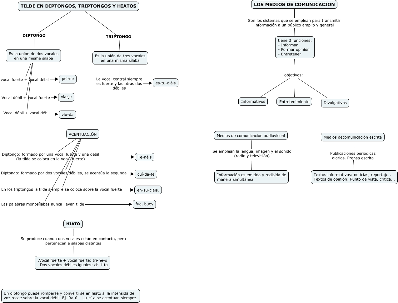 Este Cmap, tiene información relacionada con: TEMA I BIS, TILDE EN DIPTONGOS, TRIPTONGOS Y HIATOS DIPTONGO Es la unión de dos vocales en una misma sílaba, tiene 3 funciones: - Informar - Formar opinión - Entretener objetivos: Informativos, ACENTUACIÓN Diptongo: formado por dos vocales débiles, se acentúa la segunda cuí-da-te, Es la unión de tres vocales en una misma sílaba La vocal central siempre es fuerte y las otras dos débiles es-tu-diáis, tiene 3 funciones: - Informar - Formar opinión - Entretener objetivos: Entretenimiento, LOS MEDIOS DE COMUNICACION Son los sistemas que se emplean para transmitir información a un público amplio y general tiene 3 funciones: - Informar - Formar opinión - Entretener, Es la unión de dos vocales en una misma sílaba Vocal débil + vocal fuerte via-je, Es la unión de dos vocales en una misma sílaba Vocal débil + vocal débil viu-da, ACENTUACIÓN En los triptongos la tilde siempre se coloca sobre la vocal fuerte en-su-ciáis., TILDE EN DIPTONGOS, TRIPTONGOS Y HIATOS TRIPTONGO Es la unión de tres vocales en una misma sílaba, Medios decomunicación escrita Publicaciones periódicas diarias. Prensa escrita Textos informativos: noticias, reportaje.. Textos de opinión: Punto de vista, crítica..., Es la unión de dos vocales en una misma sílaba vocal fuerte + vocal débil pei-ne, Medios de comunicación audiovisual Se emplean la lengua, imagen y el sonido (radio y televisión) Información es emitida y recibida de manera simultánea, tiene 3 funciones: - Informar - Formar opinión - Entretener objetivos: Divulgativos, ACENTUACIÓN Las palabras monosílabas nunca llevan tilde fue, buey, ACENTUACIÓN Diptongo: formado por una vocal fuerte y una débil (la tilde se coloca en la vocal fuerte) Te-néis, HIATO Se produce cuando dos vocales están en contacto, pero pertenecen a sílabas distintas .Vocal fuerte + vocal fuerte: tri-ne-o . Dos vocales débiles iguales: chi-i-ta