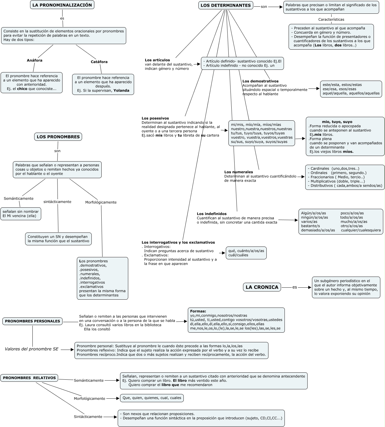Este Cmap, tiene información relacionada con: TEMA III, Palabras que precisan o limitan el significado de los sustantivos a los que acompañan Características - Preceden al sustantivo al que acompaña - Concuerda en género y número. - Desempeñan la función de presentadores o cuantificadores de los sustantivos a los que acompaña (Los libros, dos libros..), PRONOMBRES RELATIVOS Sintácticamente - Son nexos que relacionan proposiciones. - Desempeñan una función sintáctica en la preposición que introducen (sujeto, CD,CI,CC...), LOS DETERMINANTES Los artículos van delante del sustantivo, indican género y número - Artículo definido- sustantivo conocido Ej.El - Artículo indefinido - no conocido Ej. un, LA PRONOMINALIZACIÓN es Consiste en la sustitución de elementos oracionales por pronombres para evitar la repetición de palabras en un texto. Hay de dos tipos:, mi/mis, mío/mía, míos/mías nuestro,nuestra,nuestros,nuestras tu/tus, tuyo/tuya, tuyos/tuyas vuestro, vuestra,vuestros,vuestras su/sus, suyo/suya, suyos/suyas ???? mio, tuyo, suyo .Forma reducida o apocopada cuando se anteponen al sustantivo Ej.mis libros. .Forma plena cuando se posponen y van acompañados de un determinante Ej.los viejos libros míos., LOS DETERMINANTES Los demostrativos Acompañan al sustantivo situándolo espacial o temporalmente respecto al hablante este/esta, estos/estas ese/esa, esos/esas aquel/aquella, aquellos/aquellas, Palabras que señalan o representan a personas cosas u objetos o remiten hechos ya conocidos por el hablante o el oyente sintácticamente Constituyen un SN y desempeñan la misma función que el sustantivo, PRONOMBRES RELATIVOS Morfológicamente Que, quien, quienes, cual, cuales, LOS DETERMINANTES Los interrogativos y los exclamativos . Interrogativos: Indican preguntas acerca de sustantivo . Exclamativos: Proporcionan intensidad al sustantivo y a la frase en que aparecen qué, cuánto/a/os/as cuál/cuáles, Palabras que señalan o representan a personas cosas u objetos o remiten hechos ya conocidos por el hablante o el oyente Morfológicamente Los pronombres .demostrativos, .posesivos, .numerales, .indefinidos, .interrogativos .exclamativos presentan la misma forma que los determinantes, LOS DETERMINANTES son Palabras que precisan o limitan el significado de los sustantivos a los que acompañan, PRONOMBRES PERSONALES Valores del pronombre SE Pronombre personal: Sustituye al pronombre le cuando éste precede a las formas lo,la,los,las Pronombres reflexivo: Indica que el sujeto realiza la acción expresada por el verbo y a su vez lo recibe Pronombres recíproco.Indica que dos o más sujetos realizan y reciben recíprocamente, la acción del verbo., Consiste en la sustitución de elementos oracionales por pronombres para evitar la repetición de palabras en un texto. Hay de dos tipos: Anáfora El pronombre hace referencia a un elemento que ha aparecido con anterioridad. Ej. el chico que conociste..., LOS DETERMINANTES Los posesivos Determinan al sustantivo indicando si la realidad designada pertenece al hablante, al oyente o a una tercera persona Ej.sacó mis libros y tu libreta de su cartera mi/mis, mío/mía, míos/mías nuestro,nuestra,nuestros,nuestras tu/tus, tuyo/tuya, tuyos/tuyas vuestro, vuestra,vuestros,vuestras su/sus, suyo/suya, suyos/suyas, Consiste en la sustitución de elementos oracionales por pronombres para evitar la repetición de palabras en un texto. Hay de dos tipos: Catáfora El pronombre hace referencia a un elemento que ha aparecido después. Ej. Si la supervisan, Yolanda, LOS DETERMINANTES Los indefinidos Cuantifican al sustantivo de manera precisa o indefinida, sin concretar una cantida exacta Algún/a/os/as poco/a/os/as ningún/a/os/as todo/a/os/as varios/as mucho/a/os/as bastante/s otro/a/os/as demasiado/a/os/as cualquier/cualesquiera, Palabras que señalan o representan a personas cosas u objetos o remiten hechos ya conocidos por el hablante o el oyente Semánticamente señalan sin nombrar El Mi vencina (ella), LA CRONICA es Un subgénero periodístico en el que el autor informa objetivamente sobre un hecho y, al mismo tiempo, lo valora exponiendo su opinión, LOS PRONOMBRES son Palabras que señalan o representan a personas cosas u objetos o remiten hechos ya conocidos por el hablante o el oyente, PRONOMBRES PERSONALES Señalan o remiten a las personas que intervienen en una conversación o a la persona de la que se habla Ej. Laura consultó varios libros en la biblioteca Ella los consltó Formas: yo,mi,conmigo,nosotros/nostras tú,usted, ti,usted,contigo vosotros/vosotras,ustedes él,ella,ello,él,ella,ello,sí,consigo,ellos,ellas me,nos,le,os,lo,(le),la,se,le,se los(les),las,se,les,se