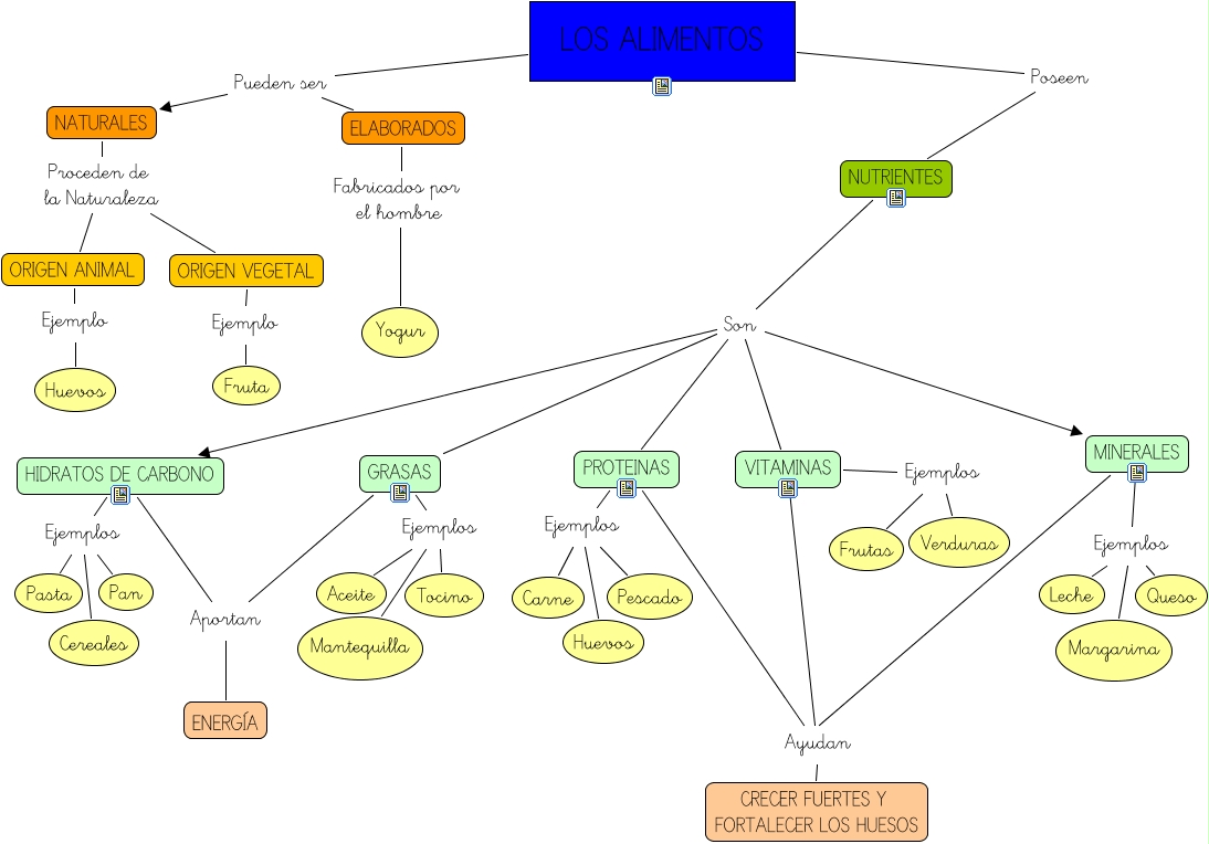 Este Cmap, tiene información relacionada con: Los alimentos, HIDRATOS DE CARBONO Aportan ENERGÍA, GRASAS Ejemplos Mantequilla, HIDRATOS DE CARBONO Ejemplos Pan, NUTRIENTES Son PROTEINAS, GRASAS Ejemplos Aceite, ELABORADOS Fabricados por el hombre Yogur, MINERALES Ayudan CRECER FUERTES Y FORTALECER LOS HUESOS, LOS ALIMENTOS Pueden ser ELABORADOS, MINERALES Ejemplos Leche, LOS ALIMENTOS Pueden ser NATURALES, NUTRIENTES Son MINERALES, PROTEINAS Ejemplos Carne, NUTRIENTES Son HIDRATOS DE CARBONO, NATURALES Proceden de la Naturaleza ORIGEN VEGETAL, VITAMINAS Ayudan CRECER FUERTES Y FORTALECER LOS HUESOS, ORIGEN ANIMAL Ejemplo Huevos, PROTEINAS Ayudan CRECER FUERTES Y FORTALECER LOS HUESOS, VITAMINAS Ejemplos Frutas, NATURALES Proceden de la Naturaleza ORIGEN ANIMAL, HIDRATOS DE CARBONO Ejemplos Pasta