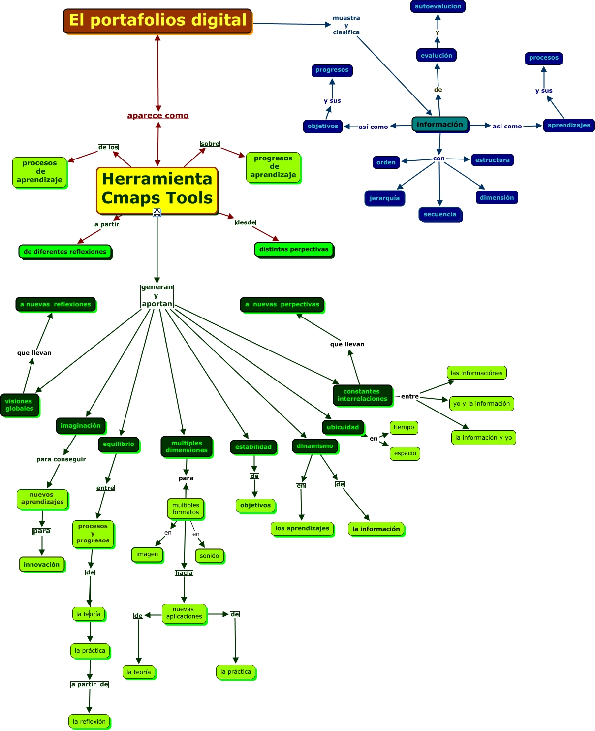 Este Cmap, tiene información relacionada con: d, multiples dimensiones para multiples formatos, la práctica a partir de la reflexión, información así como aprendizajes, información con dimensión, procesos y progresos de la práctica, Herramienta Cmaps Tools de los procesos de aprendizaje, Herramienta Cmaps Tools desde distintas perpectivas, El portafolios digital muestra y clasifica información, constantes interrelaciones entre la información y yo, estabilidad de objetivos, constantes interrelaciones entre yo y la información, información de evalución, visiones globales que llevan a nuevas reflexiones, información con secuencia, equilibrio entre procesos y progresos, constantes interrelaciones entre las informaciónes, ubicuidad en tiempo, aprendizajes y sus procesos, imaginación para conseguir nuevos aprendizajes, Herramienta Cmaps Tools generan y aportan visiones globales