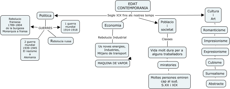 Aquest mapa conceptual conté informació relacionada amb: inesc6resumedatconteporania, miratories Moltes persones emiren cap al sud. S.XX i XIX, Vida molt dura per a alguns traballadors miratories, Poblacio i societat Classes Vida molt dura per a alguns traballadors, Cubisme Surrealisme, EDAT CONTEMPORANIA Segle XIX fins als nostres temps Poblacio i societat, Politica GUERRES Rebolucia russa, Romanticisme Impresionisme, Politica GUERRES Rebolucio fransesa 1789-1804 de la burgesia Monarquia a fransa, Politica GUERRES 1 guerra mundial 1914-1918, Politica GUERRES 2 guerra mundial 1939-1945 El nazisme a Alemania, EDAT CONTEMPORANIA Segle XIX fins als nostres temps Cultura i Art, Economia Rebolucio Industrial Us noves energies, Industries, Mitjans de transport, EDAT CONTEMPORANIA Segle XIX fins als nostres temps Economia, Surrealisme Abstracte, Cultura i Art Romanticisme, Expresionisme Cubisme, Impresionisme Expresionisme, Us noves energies, Industries, Mitjans de transport MAQUINA DE VAPOR, EDAT CONTEMPORANIA Segle XIX fins als nostres temps Politica