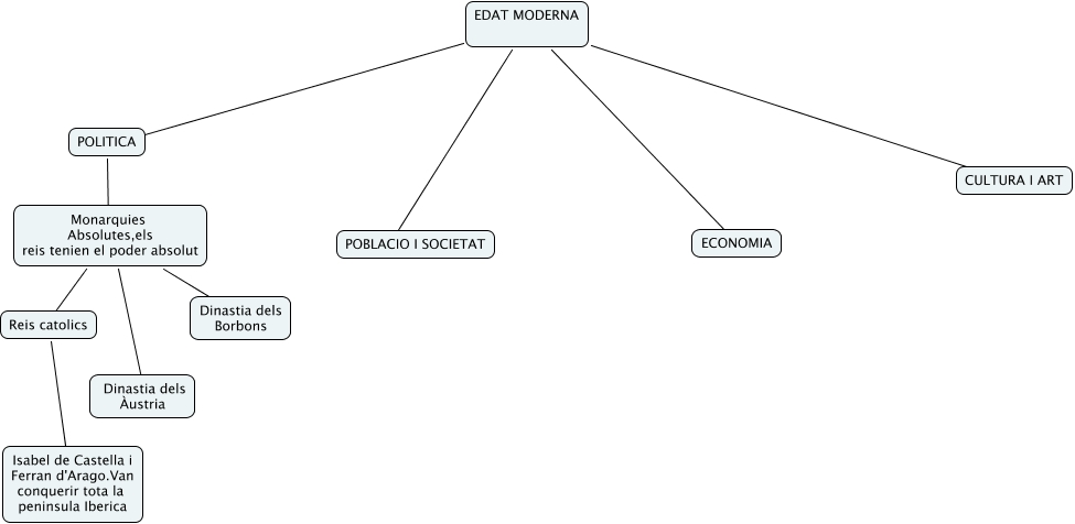 Aquest mapa conceptual conté informació relacionada amb: cristianmodernac6, EDAT MODERNA ???? ECONOMIA, EDAT MODERNA ???? POLITICA, EDAT MODERNA ???? POBLACIO I SOCIETAT, Reis catolics ???? Isabel de Castella i Ferran d'Arago.Van conquerir tota la peninsula Iberica, Monarquies Absolutes,els reis tenien el poder absolut ???? Reis catolics, Monarquies Absolutes,els reis tenien el poder absolut ???? Dinastia dels Borbons, EDAT MODERNA ???? CULTURA I ART, Monarquies Absolutes,els reis tenien el poder absolut ???? Dinastia dels Àustria, POLITICA ???? Monarquies Absolutes,els reis tenien el poder absolut