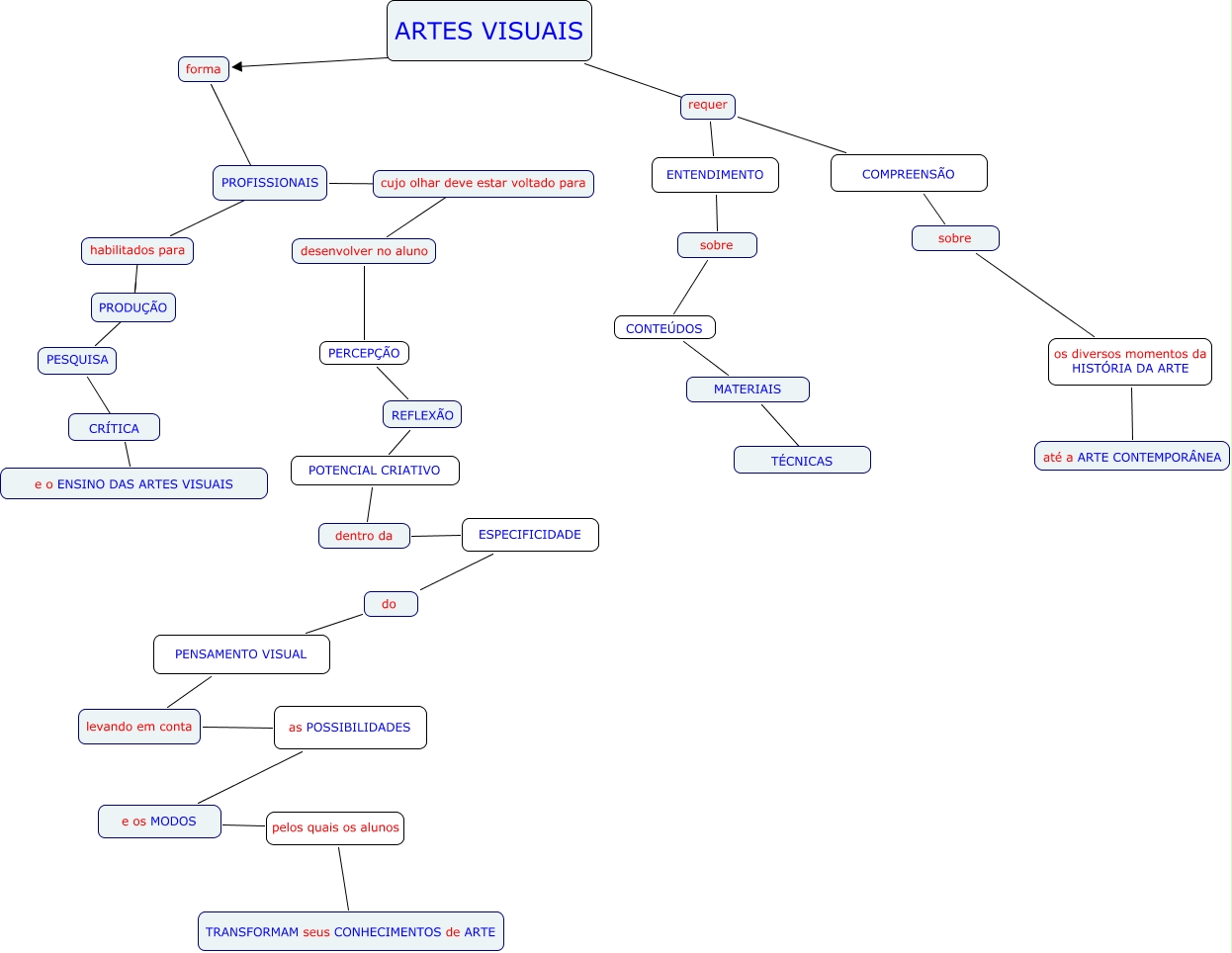 Esse mapa conceitual, produzido no IHMC CmapTools, tem a informação relacionada a: Formação de profesores de Artes Visuais, MATERIAIS ???? TÉCNICAS, ARTES VISUAIS forma, do PENSAMENTO VISUAL levando em conta, levando em conta as POSSIBILIDADES e os MODOS, requer ENTENDIMENTO sobre, sobre CONTEÚDOS MATERIAIS, PROFISSIONAIS ???? desenvolver no aluno, REFLEXÃO POTENCIAL CRIATIVO dentro da, habilitados para ???? PESQUISA, sobre os diversos momentos da HISTÓRIA DA ARTE até a ARTE CONTEMPORÂNEA, forma ???? habilitados para, dentro da ESPECIFICIDADE do, e os MODOS pelos quais os alunos TRANSFORMAM seus CONHECIMENTOS de ARTE, PESQUISA ???? e o ENSINO DAS ARTES VISUAIS, ARTES VISUAIS ???? requer, desenvolver no aluno PERCEPÇÃO REFLEXÃO, requer COMPREENSÃO sobre, habilitados para PRODUÇÃO