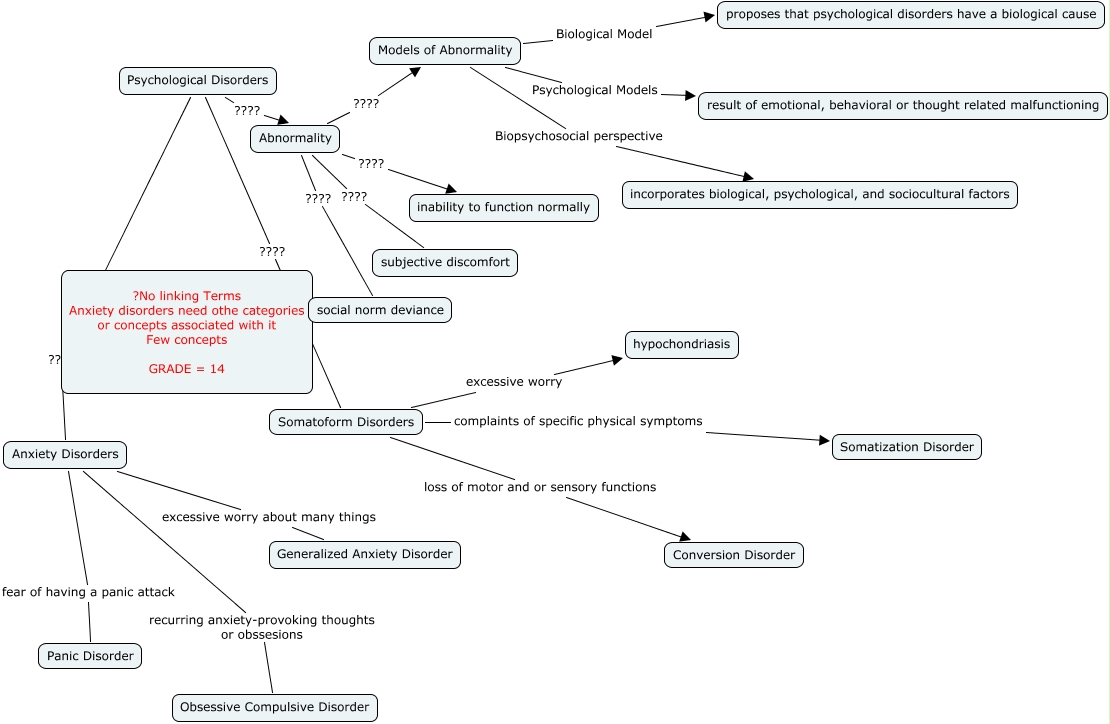 Lauren Dawson 0166 Ch.14, Abnormality ???? Models of Abnormality, Anxiety Disorders recurring anxiety-provoking thoughts or obssesions Obsessive Compulsive Disorder, Psychological Disorders ???? Somatoform Disorders, Somatoform Disorders excessive worry hypochondriasis, Models of Abnormality Psychological Models result of emotional, behavioral or thought related malfunctioning, Models of Abnormality Biological Model proposes that psychological disorders have a biological cause, Anxiety Disorders excessive worry about many things Generalized Anxiety Disorder, Anxiety Disorders fear of having a panic attack Panic Disorder, Abnormality ???? inability to function normally, Somatoform Disorders complaints of specific physical symptoms Somatization Disorder
