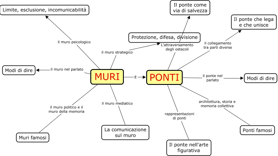 Questa Cmap, creata con IHMC CmapTools, contiene informazioni relative a: Muri e ponti, PONTI rappresentazioni di ponti Il ponte nell'arte figurativa, MURI il muro strategico Protezione, difesa, divisione, MURI il muro nel parlato Modi di dire, PONTI il ponte nel parlato Modi di dire, PONTI L'attraversamento degli ostacoli Il ponte come via di salvezza, PONTI il collegamento tra parti diverse Il ponte che lega e che unisce, MURI il muro mediatico La comunicazione sul muro, MURI E PONTI, PONTI architettura, storia e memoria collettiva Ponti famosi, MURI il muro politico e il muro della memoria Muri famosi, MURI il muro psicologico Limite, esclusione, incomunicabilità