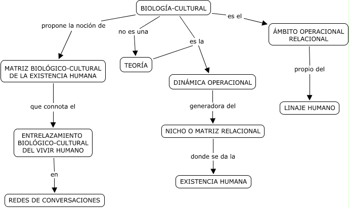 Este Cmap, tiene información relacionada con: Biología cultural, MATRIZ BIOLÓGICO-CULTURAL DE LA EXISTENCIA HUMANA que connota el ENTRELAZAMIENTO BIOLÓGICO-CULTURAL DEL VIVIR HUMANO, BIOLOGÍA-CULTURAL es la DINÁMICA OPERACIONAL, BIOLOGÍA-CULTURAL no es una TEORÍA, BIOLOGÍA-CULTURAL propone la noción de MATRIZ BIOLÓGICO-CULTURAL DE LA EXISTENCIA HUMANA, ENTRELAZAMIENTO BIOLÓGICO-CULTURAL DEL VIVIR HUMANO en REDES DE CONVERSACIONES, DINÁMICA OPERACIONAL generadora del NICHO O MATRIZ RELACIONAL, TEORÍA es la DINÁMICA OPERACIONAL, NICHO O MATRIZ RELACIONAL donde se da la EXISTENCIA HUMANA, BIOLOGÍA-CULTURAL es el ÁMBITO OPERACIONAL RELACIONAL, ÁMBITO OPERACIONAL RELACIONAL propio del LINAJE HUMANO