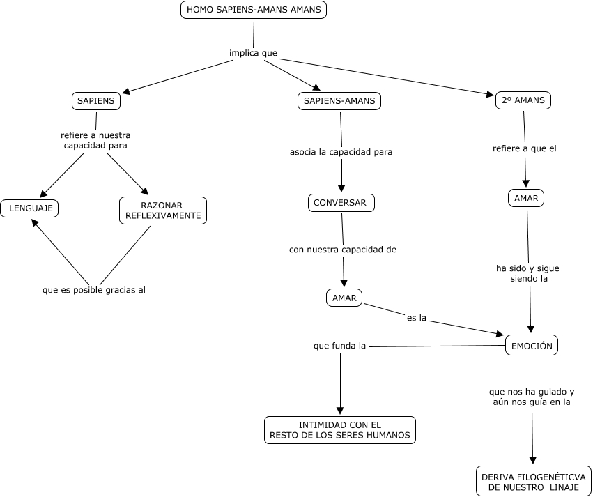 Este Cmap, tiene información relacionada con: HOMO SAPIENS-AMANS AMANS, AMAR ha sido y sigue siendo la EMOCIÓN, CONVERSAR con nuestra capacidad de AMAR, AMAR es la EMOCIÓN, EMOCIÓN que nos ha guiado y aún nos guía en la DERIVA FILOGENÉTICVA DE NUESTRO LINAJE, EMOCIÓN que funda la INTIMIDAD CON EL RESTO DE LOS SERES HUMANOS, HOMO SAPIENS-AMANS AMANS implica que 2º AMANS, SAPIENS refiere a nuestra capacidad para LENGUAJE, RAZONAR REFLEXIVAMENTE que es posible gracias al LENGUAJE, HOMO SAPIENS-AMANS AMANS implica que SAPIENS-AMANS, 2º AMANS refiere a que el AMAR, SAPIENS refiere a nuestra capacidad para RAZONAR REFLEXIVAMENTE, SAPIENS-AMANS asocia la capacidad para CONVERSAR, HOMO SAPIENS-AMANS AMANS implica que SAPIENS
