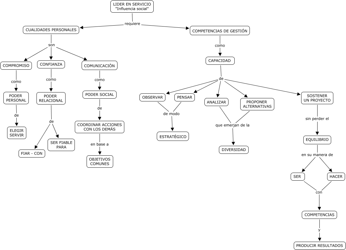 Este Cmap, tiene información relacionada con: Liderazgo en servicio, COMPETENCIAS y PRODUCIR RESULTADOS, SER con COMPETENCIAS, COMPROMISO como PODER PERSONAL, LIDER EN SERVICIO "Influencia social" requiere COMPETENCIAS DE GESTIÓN, CAPACIDAD de PROPONER ALTERNATIVAS, HACER con COMPETENCIAS, PODER PERSONAL de ELEGIR SERVIR, COMUNICACIÒN como PODER SOCIAL, PODER SOCIAL de COORDINAR ACCIONES CON LOS DEMÁS, CUALIDADES PERSONALES son COMPROMISO, SOSTENER UN PROYECTO sin perder el EQUILIBRIO, CUALIDADES PERSONALES son COMUNICACIÒN, PROPONER ALTERNATIVAS que emerjan de la DIVERSIDAD, COORDINAR ACCIONES CON LOS DEMÁS en base a OBJETIVOS COMUNES, PENSAR de modo ESTRATÉGICO, EQUILIBRIO en su manera de HACER, CONFIANZA como PODER RELACIONAL, CAPACIDAD de OBSERVAR, PODER RELACIONAL de SER FIABLE PARA, LIDER EN SERVICIO "Influencia social" requiere CUALIDADES PERSONALES