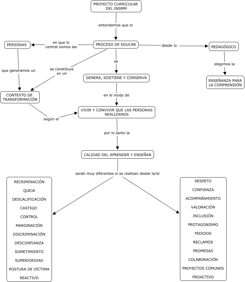 Este Cmap, tiene información relacionada con: Proyecto curricular INSMM, GENERA, SOSTIENE Y CONSERVA en el modo de VIVIR Y CONVIVIR QUE LAS PERSONAS REALIZAMOS, CALIDAD DEL APRENDER Y ENSEÑAR serán muy diferentes si se realizan desde la/el RECRIMINACIÓN QUEJA DESCALIFICACIÓN CASTIGO CONTROL MARGINACIÓN DISCRIMINACIÓN DESCONFIANZA SOMETIMIENTO SUPERIORIDAD POSTURA DE VÍCTIMA REACTIVO, PROCESO DE EDUCAR desde lo PEDAGÓGICO, PERSONAS que generamos un CONTEXTO DE TRANSFORMACIÓN, PROCESO DE EDUCAR en que lo central somos las PERSONAS, CONTEXTO DE TRANSFORMACIÓN según el VIVIR Y CONVIVIR QUE LAS PERSONAS REALIZAMOS, PEDAGÓGICO elegimos la ENSEÑANZA PARA LA COMPRENSIÓN, PROYECTO CURRICULAR DEL INSMM entendemos que el PROCESO DE EDUCAR, PROCESO DE EDUCAR se constituye en un CONTEXTO DE TRANSFORMACIÓN, PROCESO DE EDUCAR se GENERA, SOSTIENE Y CONSERVA, CALIDAD DEL APRENDER Y ENSEÑAR serán muy diferentes si se realizan desde la/el RESPETO CONFIANZA ACOMPAÑAMIENTO VALORACIÓN INCLUSIÓN PROTAGONISMO PEDIDOS RECLAMOS PROMESAS COLABORACIÓN PROYECTOS COMUNES PROACTIVO, VIVIR Y CONVIVIR QUE LAS PERSONAS REALIZAMOS por lo tanto la CALIDAD DEL APRENDER Y ENSEÑAR
