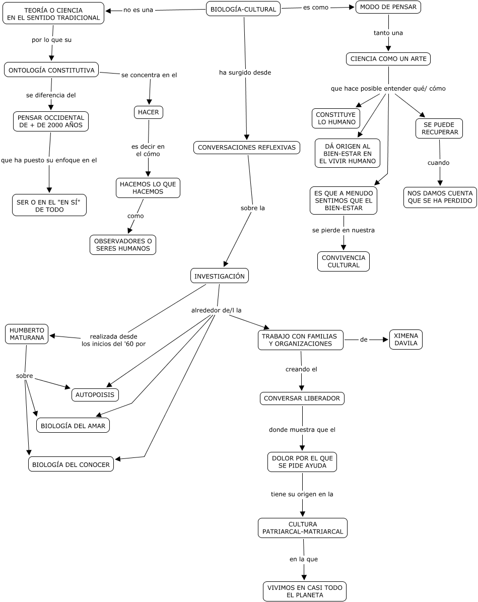 Este Cmap, tiene información relacionada con: BIOLOGÍA CULTURAL 2, DOLOR POR EL QUE SE PIDE AYUDA tiene su origen en la CULTURA PATRIARCAL-MATRIARCAL, INVESTIGACIÓN alrededor de/l la BIOLOGÍA DEL AMAR, CONVERSAR LIBERADOR donde muestra que el DOLOR POR EL QUE SE PIDE AYUDA, CIENCIA COMO UN ARTE que hace posible entender qué/ cómo DÁ ORIGEN AL BIEN-ESTAR EN EL VIVIR HUMANO, HACEMOS LO QUE HACEMOS como OBSERVADORES O SERES HUMANOS, HUMBERTO MATURANA sobre BIOLOGÍA DEL CONOCER, HUMBERTO MATURANA sobre BIOLOGÍA DEL AMAR, TEORÍA O CIENCIA EN EL SENTIDO TRADICIONAL por lo que su ONTOLOGÍA CONSTITUTIVA, INVESTIGACIÓN alrededor de/l la AUTOPOISIS, CIENCIA COMO UN ARTE que hace posible entender qué/ cómo ES QUE A MENUDO SENTIMOS QUE EL BIEN-ESTAR, BIOLOGÍA-CULTURAL no es una TEORÍA O CIENCIA EN EL SENTIDO TRADICIONAL, CONVERSACIONES REFLEXIVAS sobre la INVESTIGACIÓN, ONTOLOGÍA CONSTITUTIVA se diferencia del PENSAR OCCIDENTAL DE + DE 2000 AÑOS, INVESTIGACIÓN alrededor de/l la BIOLOGÍA DEL CONOCER, ONTOLOGÍA CONSTITUTIVA se concentra en el HACER, CIENCIA COMO UN ARTE que hace posible entender qué/ cómo CONSTITUYE LO HUMANO, PENSAR OCCIDENTAL DE + DE 2000 AÑOS que ha puesto su enfoque en el SER O EN EL "EN SÍ" DE TODO, HUMBERTO MATURANA sobre AUTOPOISIS, CULTURA PATRIARCAL-MATRIARCAL en la que VIVIMOS EN CASI TODO EL PLANETA, TRABAJO CON FAMILIAS Y ORGANIZACIONES de XIMENA DAVILA