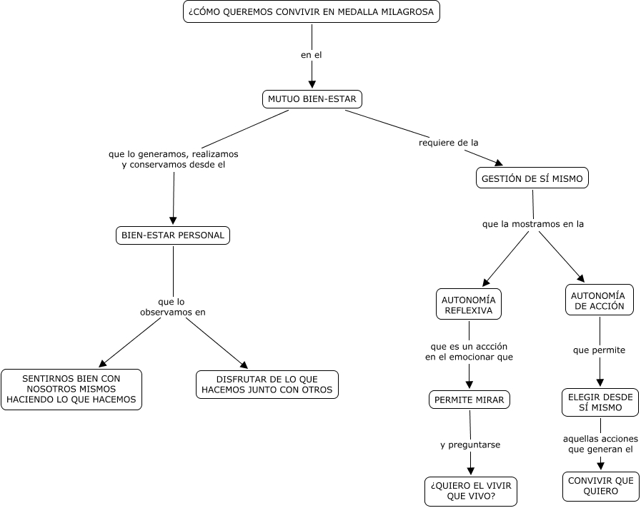 Este Cmap, tiene información relacionada con: CÓMO QUEREMOS CONVIVIR EN MEDALLA MILAGROSA, AUTONOMÍA DE ACCIÓN que permite ELEGIR DESDE SÍ MISMO, ELEGIR DESDE SÍ MISMO aquellas acciones que generan el CONVIVIR QUE QUIERO, MUTUO BIEN-ESTAR que lo generamos, realizamos y conservamos desde el BIEN-ESTAR PERSONAL, GESTIÓN DE SÍ MISMO que la mostramos en la AUTONOMÍA DE ACCIÓN, MUTUO BIEN-ESTAR requiere de la GESTIÓN DE SÍ MISMO, BIEN-ESTAR PERSONAL que lo observamos en SENTIRNOS BIEN CON NOSOTROS MISMOS HACIENDO LO QUE HACEMOS, AUTONOMÍA REFLEXIVA que es un accción en el emocionar que PERMITE MIRAR, GESTIÓN DE SÍ MISMO que la mostramos en la AUTONOMÍA REFLEXIVA, ¿CÓMO QUEREMOS CONVIVIR EN MEDALLA MILAGROSA en el MUTUO BIEN-ESTAR, PERMITE MIRAR y preguntarse ¿QUIERO EL VIVIR QUE VIVO?, BIEN-ESTAR PERSONAL que lo observamos en DISFRUTAR DE LO QUE HACEMOS JUNTO CON OTROS