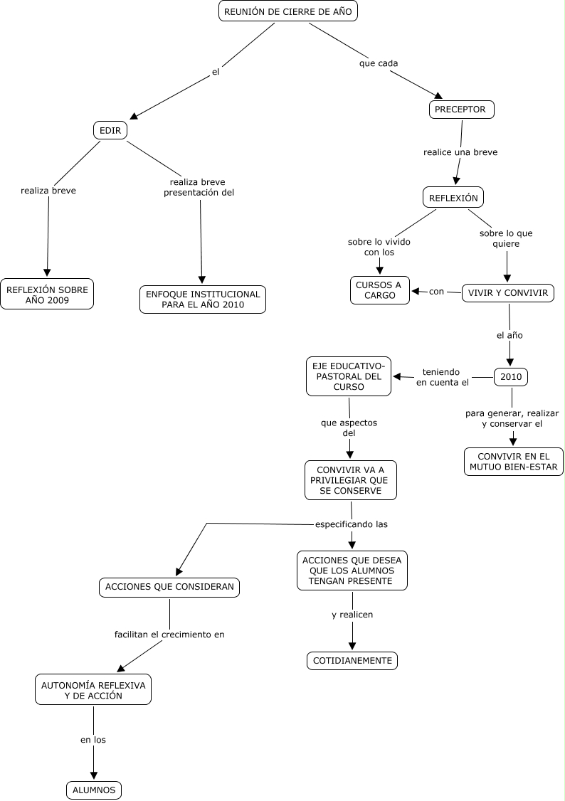Este Cmap, tiene información relacionada con: Cierre del año 2009, REFLEXIÓN sobre lo vivido con los CURSOS A CARGO, EJE EDUCATIVO- PASTORAL DEL CURSO que aspectos del CONVIVIR VA A PRIVILEGIAR QUE SE CONSERVE, CONVIVIR VA A PRIVILEGIAR QUE SE CONSERVE especificando las ACCIONES QUE DESEA QUE LOS ALUMNOS TENGAN PRESENTE, REUNIÓN DE CIERRE DE AÑO que cada PRECEPTOR, VIVIR Y CONVIVIR con CURSOS A CARGO, 2010 teniendo en cuenta el EJE EDUCATIVO- PASTORAL DEL CURSO, PRECEPTOR realice una breve REFLEXIÓN, REFLEXIÓN sobre lo que quiere VIVIR Y CONVIVIR, ACCIONES QUE CONSIDERAN facilitan el crecimiento en AUTONOMÍA REFLEXIVA Y DE ACCIÓN, EDIR realiza breve presentación del ENFOQUE INSTITUCIONAL PARA EL AÑO 2010, ACCIONES QUE DESEA QUE LOS ALUMNOS TENGAN PRESENTE y realicen COTIDIANEMENTE, VIVIR Y CONVIVIR el año 2010, REUNIÓN DE CIERRE DE AÑO el EDIR, EDIR realiza breve REFLEXIÓN SOBRE AÑO 2009, CONVIVIR VA A PRIVILEGIAR QUE SE CONSERVE especificando las ACCIONES QUE CONSIDERAN, 2010 para generar, realizar y conservar el CONVIVIR EN EL MUTUO BIEN-ESTAR, AUTONOMÍA REFLEXIVA Y DE ACCIÓN en los ALUMNOS