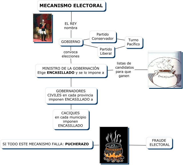 Este Cmap, tiene información relacionada con: mecanismo_electoral, MINISTRO DE LA GOBERNACIÓN Elige ENCASILLADO y se lo impone a ???? GOBERNADORES CIVILES en cada provincia imponen ENCASILLADO a, GOBIERNO ???? Partido Liberal, MINISTRO DE LA GOBERNACIÓN Elige ENCASILLADO y se lo impone a listas de candidatos para que ganen, Partido Conservador ???? Turno Pacífico, GOBIERNO ???? Partido Conservador, GOBERNADORES CIVILES en cada provincia imponen ENCASILLADO a ???? CACIQUES en cada municipio imponen ENCASILLADO, ???? FRAUDE ELECTORAL, GOBIERNO convoca elecciones MINISTRO DE LA GOBERNACIÓN Elige ENCASILLADO y se lo impone a, Partido Liberal ???? Turno Pacífico, MECANISMO ELECTORAL EL REY nombra GOBIERNO, SI TODO ESTE MECANISMO FALLA: PUCHERAZO ????