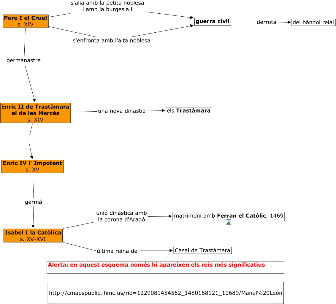 Aquest mapa conceptual conté informació relacionada amb: del regne d'astúries a la corona de castella II, Enric IV l' Impotent s. XV germà Isabel I la Catòlica s. XV-XVI, Pere I el Cruel s. XIV s'alia amb la petita noblesa i amb la burgesia i guerra civil, Isabel I la Catòlica s. XV-XVI última reina del Casal de Trastàmara, Enric II de Trastàmara el de les Mercès s. XIV una nova dinastia els Trastàmara, guerra civil derrota del bàndol reial, Enric II de Trastàmara el de les Mercès s. XIV Enric IV l' Impotent s. XV, Isabel I la Catòlica s. XV-XVI unió dinàstica amb la corona d'Aragó matrimoni amb Ferran el Catòlic, 1469, Pere I el Cruel s. XIV s'enfronta amb l'alta noblesa guerra civil, Pere I el Cruel s. XIV germanastre Enric II de Trastàmara el de les Mercès s. XIV