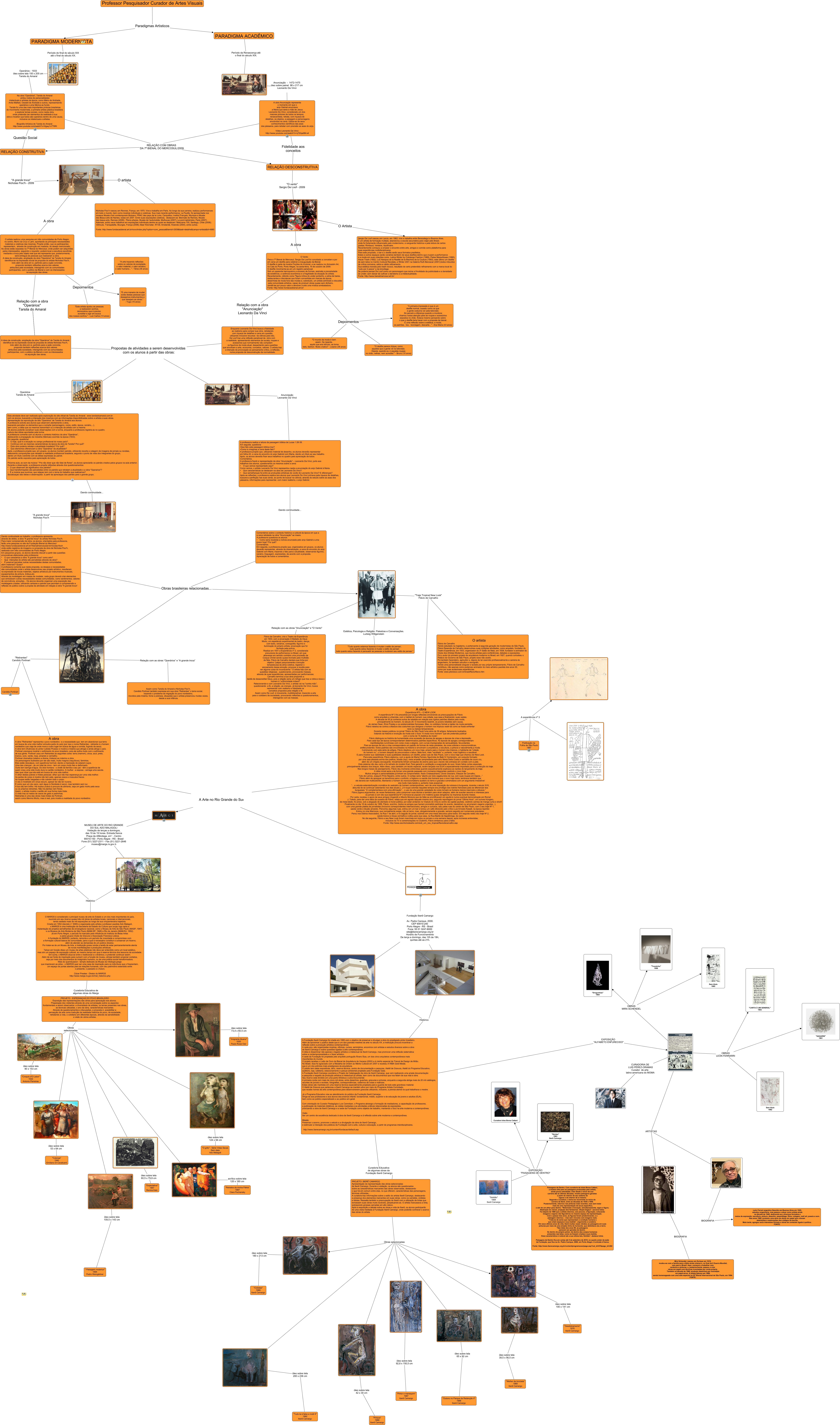 Esse mapa conceitual, produzido no IHMC CmapTools, tem a informação relacionada a: Mapa do professor pesquisador curador de artes visuais, O artista realizou uma pesquisa em três comunidades de Porto Alegre: no centro, Morro da Cruz e Lami, apontando as principais necessidades materiais e coletivas das mesmas. Propõe então, que os participantes representem, através da construção em madeira, do desejo mencionado. As obras estão expostas na 7ª Bienal do Mercosul, onde podem ser adquiridas pelos interessados, seguindo o requisito: poderá levar a escultura escolhida mediante a troca pelo objeto real que ela representa que, posteriormente, será entregue às pessoas que realizaram a obra. A ideia de construção, ampliação da obra "Operários" de Tarsila do Amaral, identifica-se na expressão social da proposta do artista Nicholas Floc'h, indo além da obra em si, partindo para a ação concreta, propondo também reflexões acerca dos valores atribuídos pela sociedade, interagindo com as comunidades participantes, com o público da Bienal e com os interessados na aquisição das obras. Depoimentos "A arte trazendo reflexões sobre os valores da sociedade, o valor material, o valor artístico, o valor humano..." - Tânia (36 anos), óleo sobre tela 42 x 30 cm "Pintura" 1989 Iberê Camargo, PROJETO : ESPERANÇAS DO POVO BRASILEIRO Exposição das representações das obras para apreciação dos alunos. Preparação dos visitantes através de uma conversação sobre os aspectos fundamentais a serem observados: a diversidade de artistas, os temas presentes nas obras, as técnicas utilizadas, o ano da obra, características marcantes. Através de questionamentos e discussões, a proposta é possibilitar a percepção da arte como tradução da realidade histórica do povo, da sociedade, retratando a vida, o cotidiano em diferentes épocas, através da sensibilidade e visão de vários artistas. Obras selecionadas, ???? OBRAS LEÓN FERRARRI "CARTA À UM GENERAL" 1963, Fonte: 1.bp.blogspot.com/.../s320/Mira+Schendel.jpg BIOGRAFIA Mira Schendel, nasceu em Zurique em 1919, mudou-se com a família para a Itália ainda criança e, no final da II Guerra Mundial, veio para o Brasil. Aqui, começou a trabalhar com cerâmica e pinturas, e, posteriormente, passou a criar obras em papel com técnicas inventadas por conta própria. Também na década de 1960, produziu desenhos por monotipia em papel-arroz. A artista faleceu em 1988, sendo homenageada com uma sala especial na 22ª Bienal Internacional de São Paulo, em 1994. FONTE:, PROJETO: IBERÊ CAMARGO Apresentação da representação das obras selecionadas de Iberê Camargo. Durante a visitação, os alunos são questionados sobre as características marcantes das obras observadas, destacando o que há em comum entre elas, no que diferem, características das personagens, técnicas utilizadas... A curadora traz informações sobre o estilo do artista Iberê Camargo, destacando a presença dos elementos marcantes em suas obras, como os carretéis, ciclistas e idiotas. Ressalta também a preocupação de Iberê com a utilização de tintas que tornassem suas obras muito duráveis, perpetuando-as. O artista manuseava a tinta, sobrepondo grossas camadas em alto relevo. Após a exposição e debate sobre as obras e vida de Iberê, os alunos participarão de uma visita mediada à Fundação Iberê Camargo, onde poderão conhecer o acervo das obras do artista. Obras selecionadas, ???? ARTISTAS Fonte: 1.bp.blogspot.com/.../s320/Mira+Schendel.jpg, RELAÇÃO CONSTRUTIVA "A grande troca" Nicholas Floc'h - 2009, A obra Experiência Nº3 – O NEW LOOK A experiência Nº 3 foi precedida por longas reflexões envolvendo as preocupações de Flávio como arquiteto e urbanista, com o habitat do homem: sua cidade, sua casa e finalizando: suas vestes. A década de 50 já conhecia surtos de rebeldia em relação aos rígidos padrões ditados pela moda, principalmente do homem, no século 20. O movimento beatnik, os jovens rebeldes sem causa, de James Dean, Elvis Presley e os existencialistas franceses. Mas, no cotidiano formal a rigidez da moda persistia. Flávio rebelou-se contra a ditadura dos costumes que obrigava o homem nos trópicos vestir-se como se fosse enfrentar neve ou baixas temperaturas. Durante meses publicou no jornal “Diário de São Paulo”uma série de 39 artigos, fartamente ilustrados, tratando da história e evolução da moda sob o título “A moda novo homem” que ele pretendia publicar com o nome de “A dialética da moda”. Flávio distinguia na história da humanidade uma sucessão de épocas de apogeu e épocas de crise e depressão. Para cada tipo de época corresponderiam determinados padrões específicos. Às épocas de apogeu corresponderiam manifestações curvilíneas com cores vivas e alegres, com curvas impregnadas de sensualidade, fecundantes. Para as épocas de luto e crise corresponderia um padrão de formas de retas paralelas, de cores sóbrias e monocromáticas, antifecundantes. Estes padrões são encontrados na história e envolviam a arquitetura, a escultura, a pintura e naturalmente,a moda. Culminando com esta série de artigos, Flávio idealizou um novo traje, próprio para o homem dos trópicos, o habitante da “cidade do homem nu”, o homem despido de preconceitos e tabus. Mais leve, mais “ventilado” e, portanto, mais higiênico e saudável. E para mostrar sua viabilidade e suas qualidades idealizou um desfile, pelas ruas de São Paulo, com o novo traje que chamou de New Look. Para esta experiência, Flávio elaborou, com a ajuda de Maria Ferrara, figurinista do Balé IV Centenário, um conjunto formado por uma saia plissada acima dos joelhos, blusão (top), meia arrastão (emprestada pela atriz Maria Della Costa) e sandália de couro cru, além de um chapéu esvoaçante. Inicialmente tinham armações de arame para que o tecido não entrasse em contato com a pele. Este sistema não deu certo e foi re