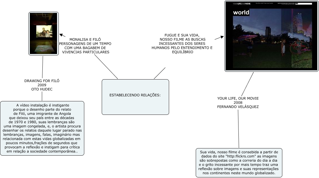 Esse mapa conceitual, produzido no IHMC CmapTools, tem a informação relacionada a: BIENAL, ESTABELECENDO RELAÇÕES: MONALISA E FILÓ PERSONAGENS DE UM TEMPO COM UMA BAGABEM DE VIVENCIAS PARTICULARES ????, ???? DRAWING FOR FILÓ 2009 OTO HUDEC A vídeo instalação é instigante porque o desenho parte do relato de Filó, uma imigrante de Angola que deixou seu país entre as décadas de 1970 e 1980, suas lembranças são uma imagem congelada, e, o artista procura desenhar os relatos daquele lugar parado nas lembranças, imagens, falas, imaginário mas relacionada com estas vidas globalizadas em poucos minutos,frações de segundos que provocam a reflexão e instigam para crítica em relação a sociedade contemporânea.., ???? YOUR LIFE, OUR MOVIE 2008 FERNANDO VELÁSQUEZ Sua vida, nosso filme é consebida a partir de dados do site "http:flickrs.com" as imagens são sobrepostas como a correria do dia a dia e o grito incessante por mais tempo traz uma reflexão sobre imagens e suas representações nos continentes neste mundo globalizado., ESTABELECENDO RELAÇÕES: FUGUE E SUA VIDA, NOSSO FILME AS BUSCAS INCESSANTES DOS SERES HUMANOS PELO ENTENDIMENTO E EQUILÍBRIO ????