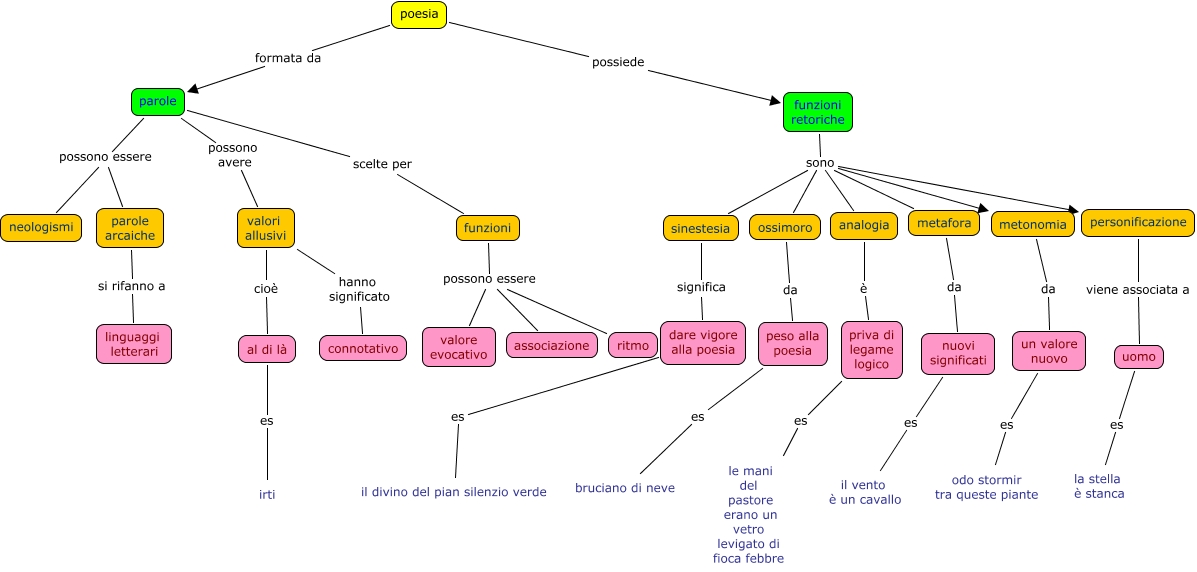 Questa Cmap, creata con IHMC CmapTools, contiene informazioni relative a: poesia, parole possono avere valori allusivi, parole possono essere parole arcaiche, peso alla poesia es bruciano di neve, funzioni retoriche sono sinestesia, poesia possiede funzioni retoriche, parole scelte per funzioni, analogia è priva di legame logico, metafora da nuovi significati, funzioni possono essere valore evocativo, funzioni possono essere ritmo, uomo es la stella è stanca, funzioni retoriche sono ossimoro, sinestesia significa dare vigore alla poesia, funzioni retoriche sono personificazione, valori allusivi hanno significato connotativo, metonomia da un valore nuovo, ossimoro da peso alla poesia, priva di legame logico es le mani del pastore erano un vetro levigato di fioca febbre, valori allusivi cioè al di là, funzioni retoriche sono analogia