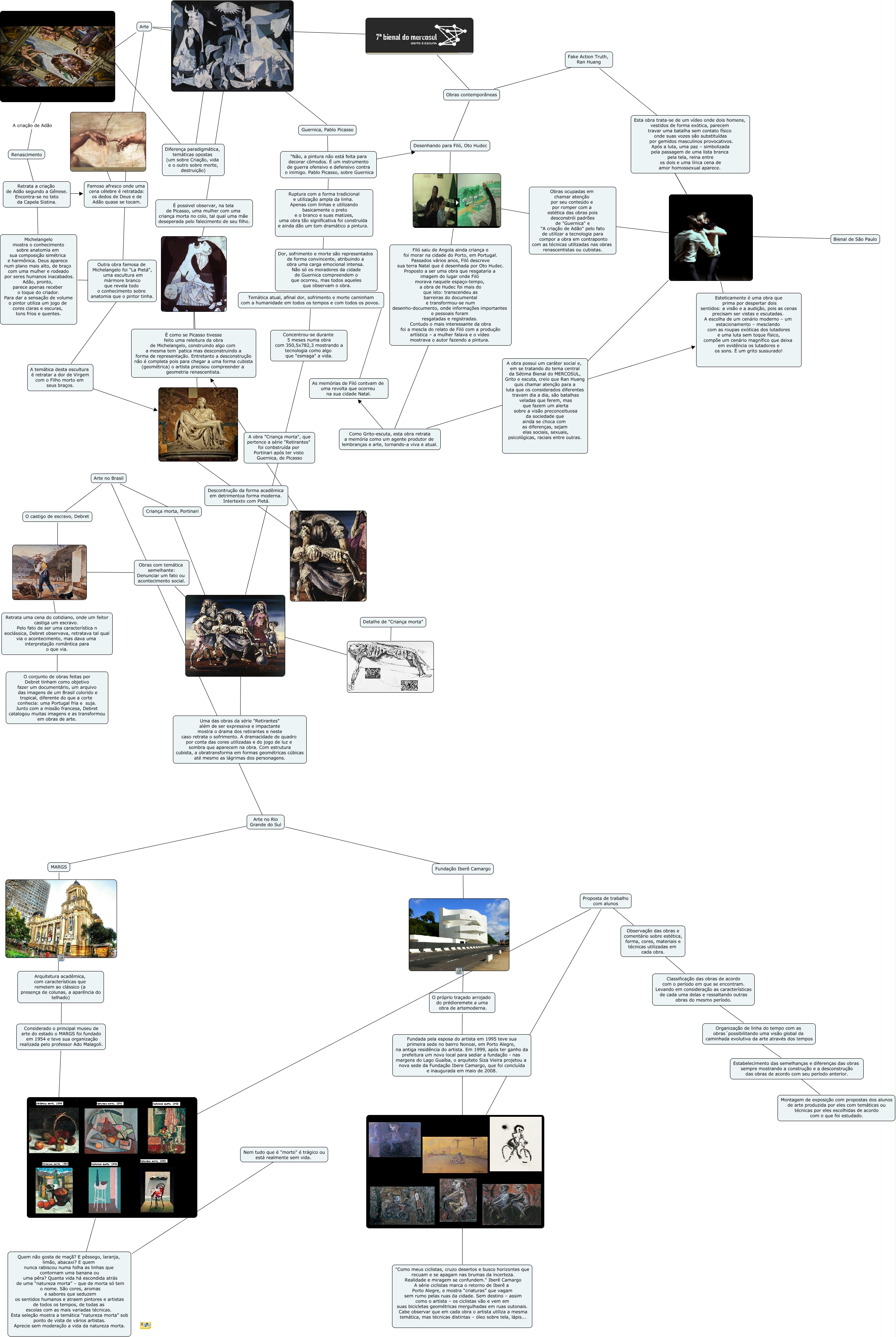 Esse mapa conceitual, produzido no IHMC CmapTools, tem a informação relacionada a: Rossele Carvalho, ???? É possivel observar, na tela de Picasso, uma mulher com uma criança morta no colo, tal qual uma mãe deseperada pelo falecimento de seu filho., "Não, a pintura não está feita para decorar cômodos. É um instrumento de guerra ofensivo e defensivo contra o inimigo. Pablo Picasso, sobre Guernica ???? Ruptura com a forma tradicional e utilização ampla da linha. Apenas com linhas e utilizando basicamente o preto e o branco e suas matizes, uma obra tão significativa foi construída e ainda dão um tom dramático a pintura., Fundada pela esposa do artista em 1995 teve sua primeira sede no bairro Nonoai, em Porto Alegre, na antiga residência do artista. Em 1999, após ter ganho da prefeitura um novo local para sediar a fundação - nas margens do Lago Guaíba, o arquiteto Siza Vieira projetou a nova sede da Fundação Ibere Camargo, que foi concluída e inaugurada em maio de 2008. ???? "Como meus ciclistas, cruzo desertos e busco horizontes que recuam e se apagam nas brumas da incerteza. Realidade e miragem se confundem." Iberê Camargo A série ciclistas marca o retorno de Iberê a Porto Alegre, e mostra “criaturas” que vagam sem rumo pelas ruas da cidade. Sem destino – assim como o artista – os ciclistas vão e vem em suas bicicletas geométricas mergulhadas em ruas outonais. Cabe observar que em cada obra o artista utiliza a mesma temática, mas técnicas distintas – óleo sobre tela, lápis..., Diferença paradigmática, temáticas opostas (um sobre Criação, vida e o outro sobre morte, destruição) ???? ????, ????, Ruptura com a forma tradicional e utilização ampla da linha. Apenas com linhas e utilizando basicamente o preto e o branco e suas matizes, uma obra tão significativa foi construída e ainda dão um tom dramático a pintura. ???? Dor, sofrimento e morte são representados de forma convincente, atribuindo a obra uma carga emocional intensa. Não só os moradores da cidade de Guernica compreendem o que ocorreu, mas todos aqueles que observam o obra., Montagem de exposição com propostas dos alunos de arte produzida por eles com temáticas ou técnicas por eles escolhidas de acordo com o que foi estudado. ???? Estabelecimento das semelhanças e diferenças das obras sempre mostrando a construção e a desconstrução das obras de acordo com seu período anterior., Guernica, Pablo Picasso ???? "Não, a pintura não está feita para decorar cômodos. É um instrumento de guerra ofensivo e defensivo contra o inimigo. Pablo Picasso, sobre Guernica, "Não, a pintura não está feita para decorar cômodos. É um instrumento de guerra ofensivo e defensivo contra o inimigo. Pablo Picasso, sobre Guernica ???? Ruptura com a forma tradicional e utilização ampla da linha. Apenas com linhas e utilizando basicamente o preto e o branco e suas matizes, uma obra tão significativa foi construída e ainda dão um tom dramático a pintura., O castigo de escravo, Debret ????, Como Grito-escuta, esta obra retrata a memória como um agente produtor de lembranças e arte, tornando-a viva e atual. ???? Esteticamente é uma obra que prima por despertar dois sentidos: a visão e a audição, pois as cenas precisam ser vistas e escutadas. A escolha de um cenário moderno – um estacionamento – mesclando com as roupas exóticas dos lutadores e uma luta sem toque físico, compõe um cenário magnífico que deixa em evidência os lutadores e os sons. É um grito sussurado!, ???? Concentrou-se durante 5 meses numa obra com 350,5x782,3 mostrando a tecnologia como algo que "esmaga" a vida., Desenhando para Filó, Oto Hudec ????, Diferença paradigmática, temáticas opostas (um sobre Criação, vida e o outro sobre morte, destruição) ????, Classificação das obras de acordo com o período em que se encontram. Levando em consideração as características de cada uma delas e ressaltando outras obras do mesmo período. ???? Observação das obras e comentário sobre estética, forma, cores, materiais e técnicas utilizadas em cada obra., Fake Action Truth, Ran Huang ???? Esta obra trata-se de um vídeo onde dois homens, vestidos de forma exótica, parecem travar uma batalha sem contato físico onde suas vozes são substituídas por gemidos masculinos provocativos. Após a luta, uma paz – simbolizada pela passagem de uma lista branca pela tela, reina entre os dois e uma lírica cena de amor homossexual aparece., "Não, a pintura não está feita para decorar cômodos. É um instrumento de guerra ofensivo e defensivo contra o inimigo. Pablo Picasso, sobre Guernica ???? Ruptura com a forma tradicional e utilização ampla da linha. Apenas com linhas e utilizando basicamente o preto e o branco e suas matizes, uma obra tão significativa foi construída e ainda dão um tom dramático a pintura., "Como meus ciclistas, cruzo desertos e busco horizontes que recuam e se apagam nas brumas da incerteza. Realidade e miragem se confundem." Iberê Camargo A série ciclistas marca o retorno de Iberê a Porto Alegre, e mostra “criaturas” que vagam sem rumo pelas ruas da cidade. Sem destino – assim como o artista – os ciclistas vão e vem em suas bicicletas geométricas mergulhadas em ruas outonais. Cabe observar que em cada obra o artista utiliza a mesma temática, mas técnicas distintas – óleo sobre tela, lápis... ????, ???? Como Grito-escuta, esta obra retrata a memória como um agente produtor de lembranças e arte, tornando-a viva e atual., Proposta de trabalho com alunos ???? Fundada pela esposa do artista em 1995 teve sua primeira sede no bairro Nonoai, em Porto Alegre, na antiga residência do artista. Em 1999, após ter ganho da prefeitura um novo local para sediar a fundação - nas margens do Lago Guaíba, o arquiteto Siza Vieira projetou a nova sede da Fundação Ibere Camargo, que foi concluída e inaugurada em maio de 2008.